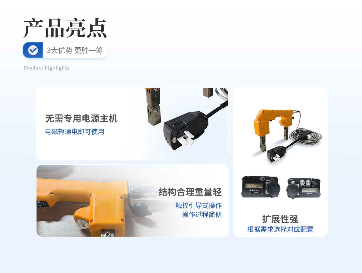 1、 無需專用電源主機,電磁軛通電即可使用; | 2、 體積小巧,重量輕; | 3、 開模制作,結構合理,手感舒適; | 4、 配專用儀器箱,電源配專用工作腰包 | 5、 逆變交流鋰電池可滿足不方便拖電源線,且需要采用交流磁化的的場所使用。 |