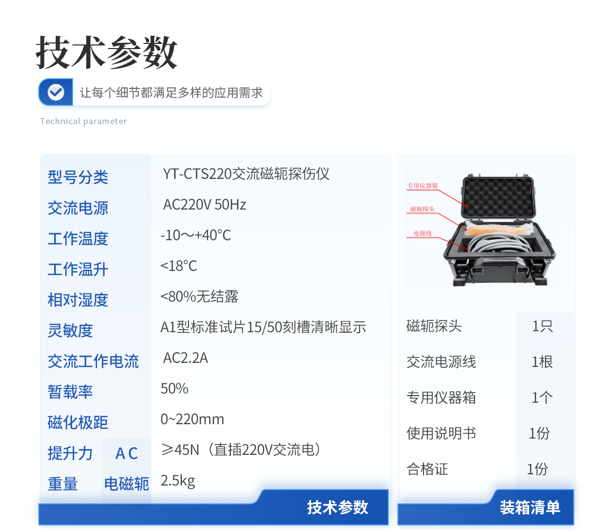 型 號 分 類:YT-CTS-N型電磁軛探傷儀 | 交流電源:AC220V 50Hz | 工作溫度:-10~+40℃ | 工作溫升:<18℃> | 相對濕度:<80%無結露> | 靈敏度:A1型標準試片15/50刻槽清晰顯示 | 工作電流:AC2.2A | 充電電源:110-240V | 充電時間:約6小時 | 電池使用時間:4h/6h(AC) | 暫載率:50% | 磁 化 極 距:0~220mm | 提升力:A C ≥45N(連接交流鋰電池) | 重量: (1)電磁軛:2.5kg (2)交流磁化電源(鋰電池):1kg |
