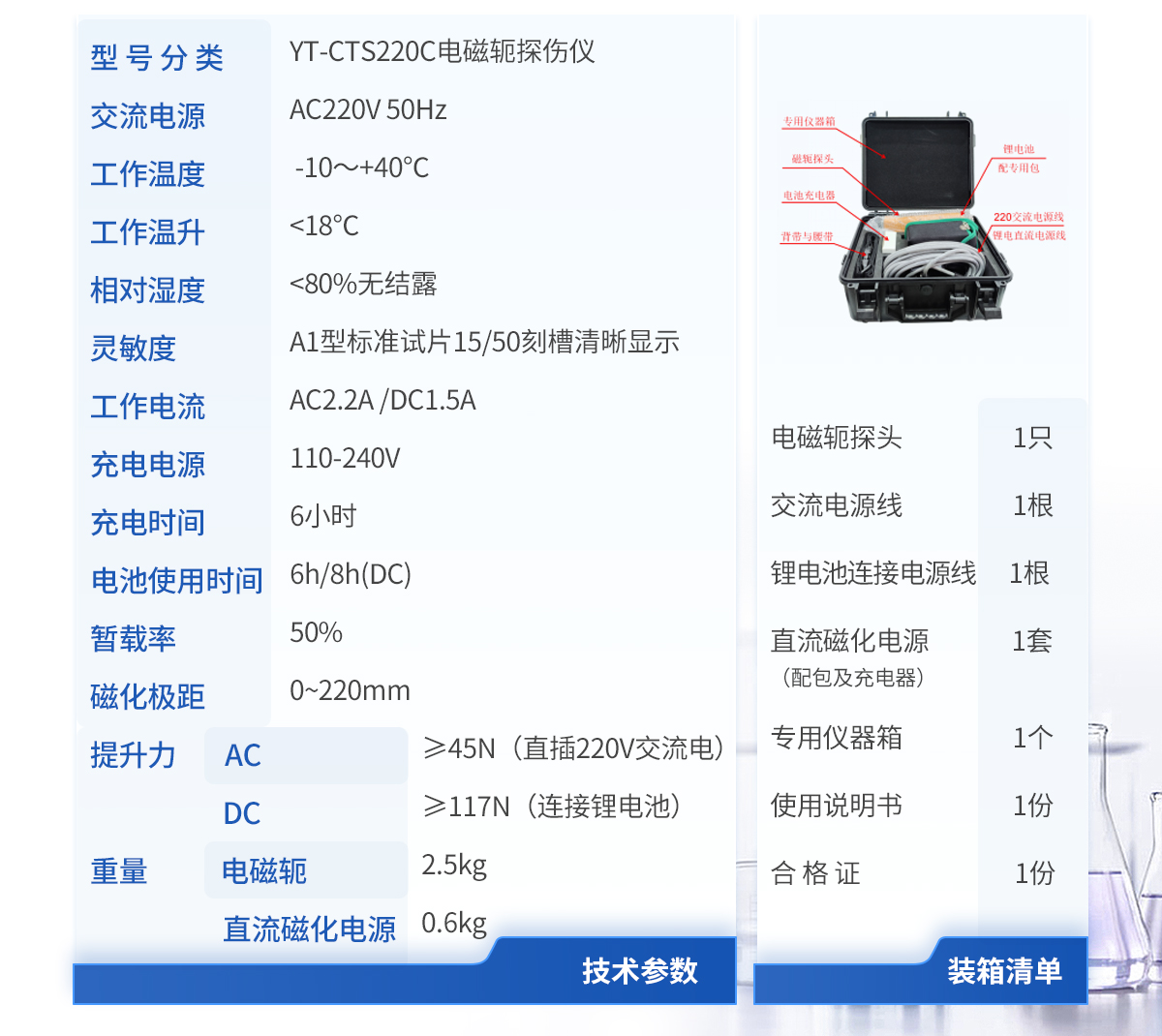 1.電磁軛探頭 1 只 | 2.鋰電池連接電源線 1 根 | 3.逆變交流磁化電源(配包及充電器) 1 套 | 4.專用儀器箱 1 個 | 5.使用說明書 1 份 | 6.合 格 證 1 份 |