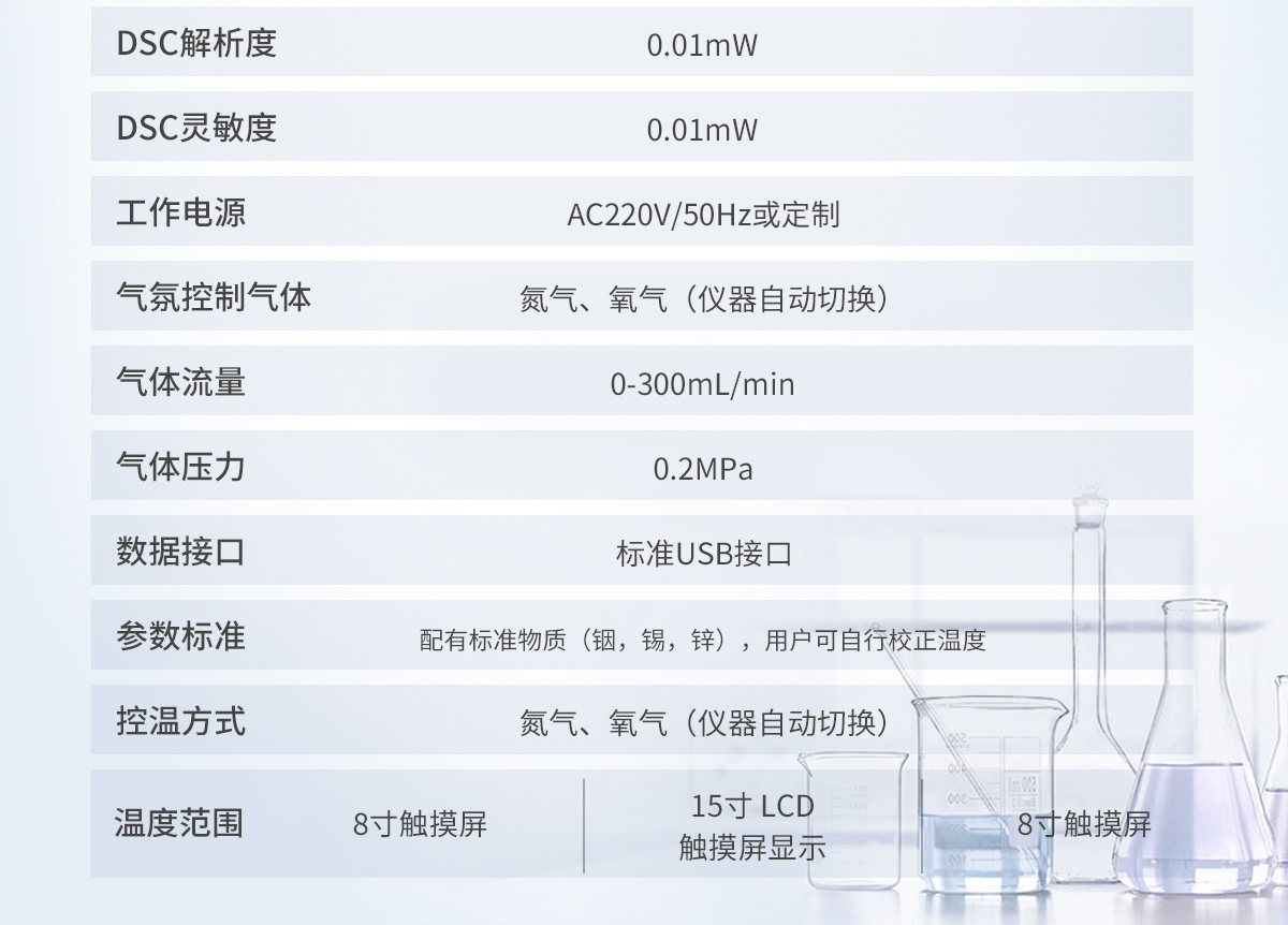 1.溫度范圍: 室溫~500℃ 2.溫度分辨率: 0.01℃ 3.溫度波動: ±0.1℃ 4.溫度重復性: ±0.1℃ 5.升溫速率: 0.1~100℃/min 6.恒溫時間:建議<24h 7.控溫方式:升溫,恒溫(全自動程序控制) 8.DSC量程: 0~±600mW 9.DSC解析度: 0.01mW 10.DSC靈敏度: 0.01mW 11.工作電源: AC220V/50Hz或定制 12. 氣氛控制氣體:氮氣、氧氣(儀器自動切換) 13.氣體流量:0-300mL/min 14.氣體壓力:0.2MPa 15.顯示方式: 8寸 LCD觸摸屏顯示,超硬度儀器面膜設計。