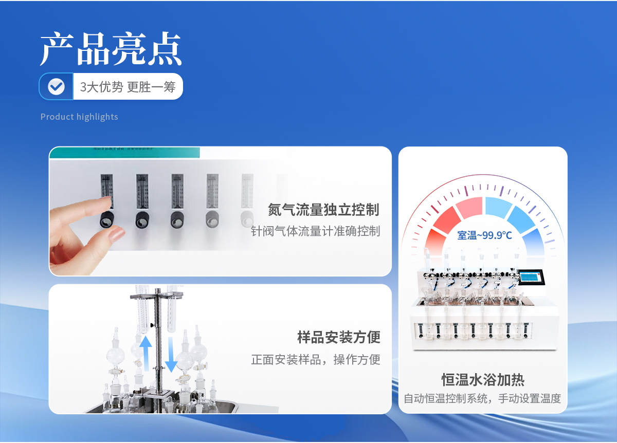 1、大容量反應瓶,可同時處理多個樣品。 2、鹽酸口、氣體進口、出口三口一體且相互獨立,操作會不干擾。 3、恒溫水浴加熱,具有快速自動恒溫控制系統,加熱溫度可以手動設定。 4、由升降位置固定旋鈕調節樣品架及配氣系統的升降旋轉樣品架,正面安裝樣品,操作方便。 5、每個樣品的氮氣流量獨立控制調節或關閉,針閥氣體流量計準確控制和顯示氣體總消耗量。