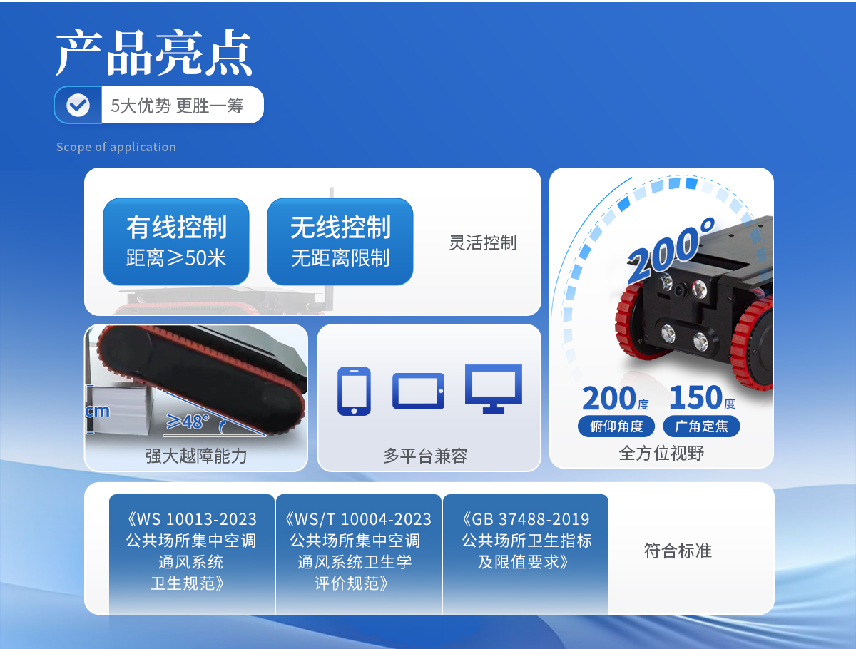 合規性:完全符合《WS 10013-2023》、《WS/T 10004-2023》及《GB 37488-2019》中對集中空調定量采樣機器人的要求。 緊湊設計:尺寸長寬高310mm * 160mm * 100mm,可進入*小尺寸為100×160毫米的矩形鐵皮風管內部進行采樣。 精準采樣:提供刮拭法和擦拭法兩種采樣方法,采樣器取樣面積50平方厘米,密閉雙采樣器加裝氣流回風道,并使用光固化3D打印技術制造,保障了采樣面積的有效性。布條和擁有專利設計的刮板夾安裝方便快捷,現場操作時可**限度地杜絕二次污染,實現無菌操作。采樣誤差小于5%,采樣偏差小于3%。 全方位視野:前置攝像頭俯仰角度達200度,前后均采用150度廣角定焦攝像頭,提供無死角視野。 靈活控制:支持無線與有線兩種控制方式,有線控制距離≥50米,無線控制無距離限制。視頻采集、拍照及機器人控制均由終端完成。 強大越障能力:越障礙高度≥7cm,爬坡角度≥48度,整機含電池工作重量僅為4.0KG。 全自動采樣:軟件控制加入了《集塵量采樣》與《微生物采樣》的全自動一鍵采樣功能,無需人工干預即可完成所有采樣動作。 耐用材質:整機不低于95%的材料使用航空鋁合金,表面經過氧化噴砂處理并增厚鈍化膜,增加表面硬度。機體行走模塊一體成型,總重不超過4KG。 多平臺兼容:支持安卓系統、鴻蒙系統的手機、平板、電腦進行控制操作。 **續航:配備4000mAh容量的動力電池,充電時間≤4小時,單次充電后可持續運行約5-6小時。