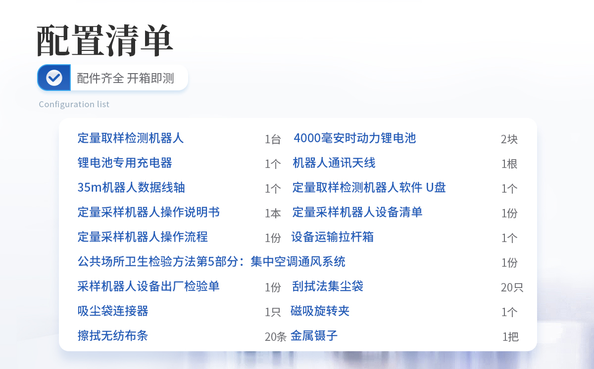 定量取樣檢測機器人:1臺 4000毫安時動力鋰電池:2塊 鋰電池專用充電器:1個 機器人通訊天線:1根 35m機器人數據線軸:1個 定量取樣檢測機器人軟件 U盤:1個 定量采樣機器人操作說明書:1本 定量采樣機器人設備清單:1份 定量采樣機器人操作流程:1份 公共場所衛生檢驗方法第5部分:集中空調通風系統:1份 采樣機器人設備出廠檢驗單:1份 刮拭法集塵袋 :20只 吸塵袋連接器 :1只 磁吸旋轉夾:1個 擦拭無紡布條 :20條 金屬鑷子:1把 設備運輸拉桿箱:1個