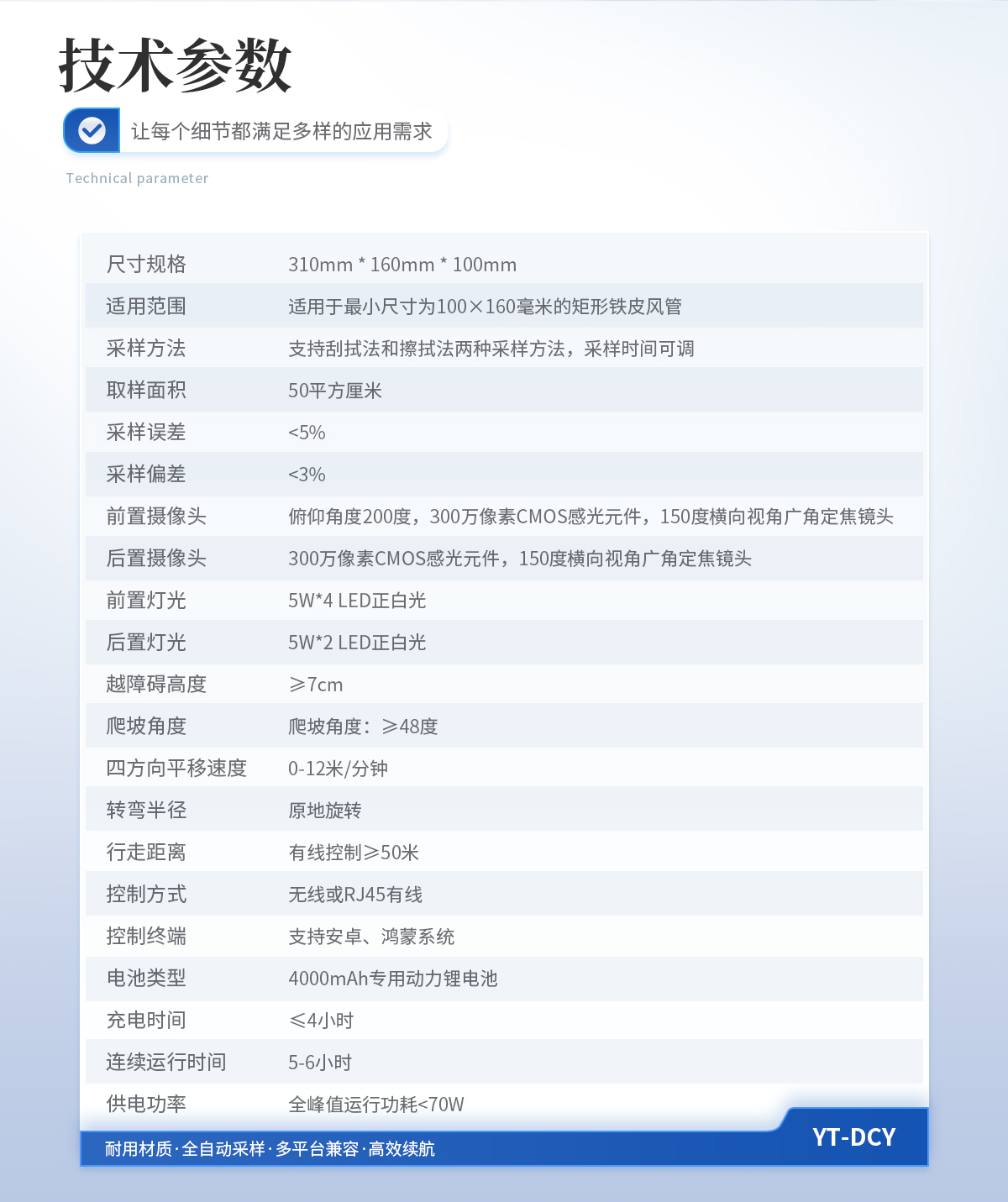 尺寸規格:310mm * 160mm * 100mm; 適用范圍:適用于*小尺寸為100×160毫米的矩形鐵皮風管; 采樣方法:支持刮拭法和擦拭法兩種采樣方法,采樣時間可調; 取樣面積:50平方厘米; 采樣誤差:<5%; 采樣偏差:<3%; 前置攝像頭:俯仰角度200度,300萬像素CMOS感光元件,150度橫向視角廣角定焦鏡頭; 后置攝像頭:300萬像素CMOS感光元件,150度橫向視角廣角定焦鏡頭; 前置燈光:5W*4 LED正白光; 后置燈光:5W*2 LED正白光; 越障礙高度:≥7cm; 爬坡角度:≥48度; 四方向平移速度:0-12米/分鐘; 轉彎半徑:原地旋轉; 行走距離:有線控制≥50米; 控制方式:無線或RJ45有線; 控制終端:支持安卓、鴻蒙系統; 電池類型:4000mAh專用動力鋰電池; 充電時間:≤4小時; 連續運行時間:5-6小時; 供電功率:全峰值運行功耗<70W;
