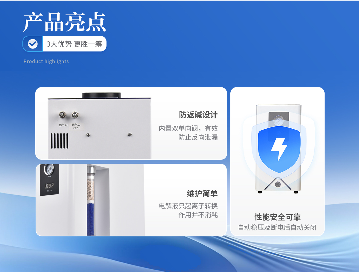 1、可替代高壓鋼瓶,雙陰極不銹鋼電解分離池,電解制氮、開機產氣、靈活方便 | 2、低廉的維護成本,正常使用中只需要添加純凈水即可連續使用 | 3、獨特的防返液裝置,使得儀器無反液現象,三級純度做到更好凈化 | 4、大容量儲水器,使得一次加水可達數日連續不間斷運行 | 5、一次性拉伸模具的凈化管使得漏點減小,更大可能的保護儀器可靠性 |