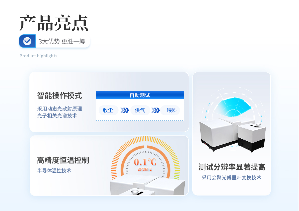 高測試分辨率 :采用會聚光傅里葉變換技術,不僅克服了透鏡孔徑對散射角的限制,在有限的空間內實現(xiàn)量程的大范圍擴展,并添加多個輔助集成光電探測器,能有效采集測試量程所對應的各個角度的散射光,實現(xiàn)全量程內的測試準確度和可靠性。 | 科學合理的干法分散系統(tǒng) :采用紊流分散技術,利用激波的剪切效果,使顆粒樣品達到充分的分散,分散系統(tǒng)關鍵部位采用耐磨陶瓷,不僅提高了使用壽命,而且還保證測試結果更加準確和穩(wěn)定。 | 智能操作模式 :具有智能化全自動操作方式,實現(xiàn)一鍵測試,即只要加入樣品,啟動儀器控制面板上的“自動測試”鍵,所有儀器的操作過程包括收塵、供氣、喂料全部自動完成,操作者只需操作計算機即可,不僅減小了操作者的工作量,更重要的是消除了因人為因素而造成的誤差,進一步提高了測試精度和結果的真實性。 | 頻譜放大技術 :增強探頭對信號的靈敏度,極大地提高了測試范圍;運用會聚光傅里葉變換技術,使得大角度散射光不受透鏡孔徑的限制,有效提高了儀器的分辨能力。 |