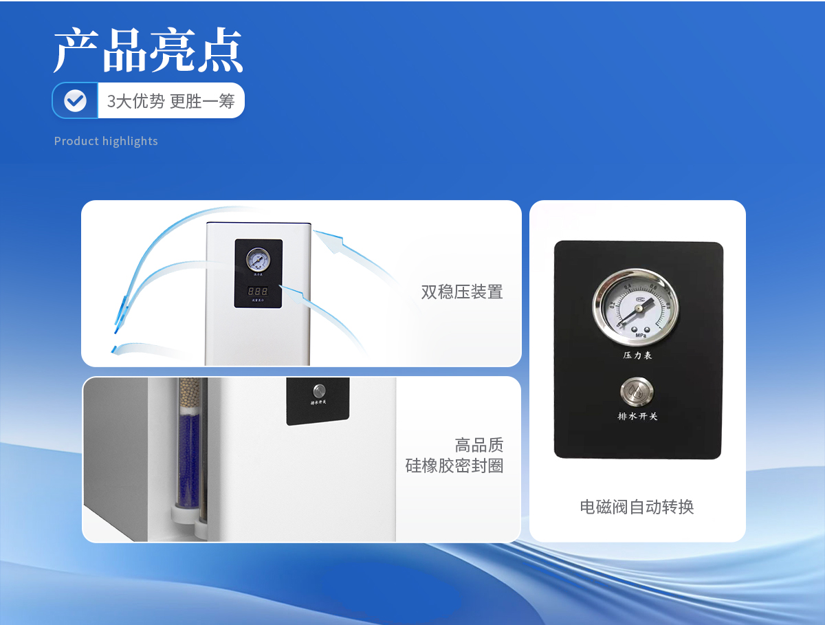 1、雙穩壓裝置,確保高精度穩壓條件下氣體流量的穩定性。 2、電磁閥自動轉換,徹底杜絕了電磁閥在自動放水時產生的連續噪音,實現放水、轉換一體化。 3、儀器內部采用硅橡膠圈,含硫量低有效提高氣體質量,保證色譜基線穩定。 4、體積小,雙支FV型亞克力過濾器,耐壓高,不會因工作環境及腐蝕氣體的影響,導致過濾管變形,開裂而產生漏氣現象,可持久使用,一勞永逸。