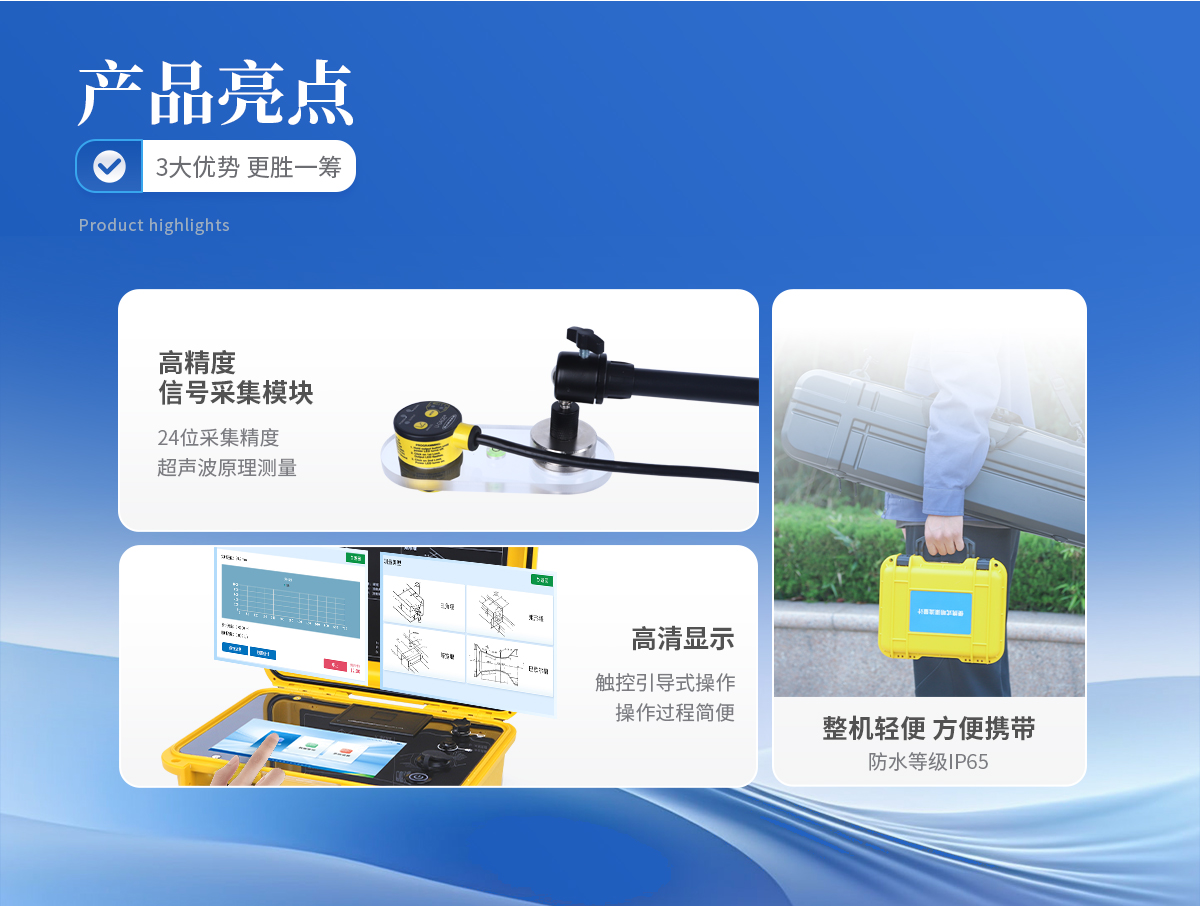適應(yīng)于四種基本堰型:三角堰、 矩形堰、 等寬堰、 巴歇爾槽 高精度信號采集模塊,24 位采集精度,測量數(shù)據(jù)真實(shí)有效 大屏幕彩色液晶觸摸屏,觸控引導(dǎo)式操作,操作過程簡便 曲線顯示流量變化趨勢及液位變化趨勢 友好的人機(jī)交互界面,圖文結(jié)合,即可對儀器進(jìn)行操作 儀器帶有微型打印機(jī),可現(xiàn)場直接打印測量數(shù)據(jù) 可與電腦連接,將測量數(shù)據(jù)輸出至電腦,便于用戶對數(shù)據(jù)進(jìn)行統(tǒng)計分析 可存儲 50000 次的測量歷史記錄 內(nèi)含大容量鋰電池,一次充電可連續(xù)測量 72 小時 流量計內(nèi)置智能化電源管理系統(tǒng),延長電池使用壽命 開機(jī)密碼進(jìn)入,有效保護(hù)測量比對數(shù)據(jù)及結(jié)果 手提箱式設(shè)計,整機(jī)重量輕,方便用戶攜帶 具有USB數(shù)據(jù)導(dǎo)出和打印機(jī)數(shù)據(jù)打印功能 可選配GRS或北頭定位功能