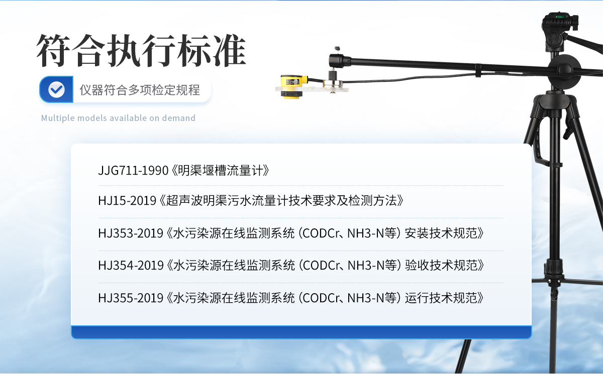 JJG 711-1990 《明渠堰槽流量計》 ZJJ-LR-01-2022《超聲波明渠流量計試行檢定規(guī)程》 HJ 15-2019 《超聲波明渠污水流量計技術(shù)要求及檢測方法》 HJ 353-2019 《水污染源在線監(jiān)測系統(tǒng)(CODCr、NH3-N等)安裝技術(shù)規(guī)范》 HJ 354-2019 《水污染源在線監(jiān)測系統(tǒng)(CODCr、NH3-N 等)驗收技術(shù)規(guī)范》 HJ 355-2019 《水污染源在線監(jiān)測系統(tǒng)(CODCr、NH3-N等)運(yùn)行技術(shù)規(guī)范》