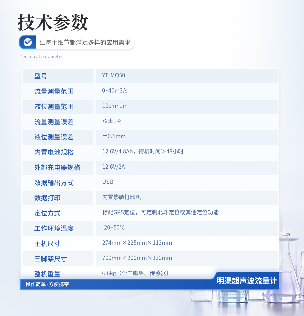 流量測量范圍 0~40m3/s 流量測量頻次 3次/秒 液位測量誤差 ≤0.5mm 流量測量誤差 ≤±1% 液位分辨率 0.1mm 探測距離 標(biāo)配1米,可選配2米 信號輸出方式 USB 工作環(huán)境濕度 ≤85% 工作環(huán)境溫度 -20℃~+50℃v 工作電源 AC220V ±15% 內(nèi)置電池 16.8V/2.6Ah 電池供電連續(xù)工作時間 >72 小時 外形尺寸 270mm×215mm×105mm 整機(jī)重量 2.4Kg
