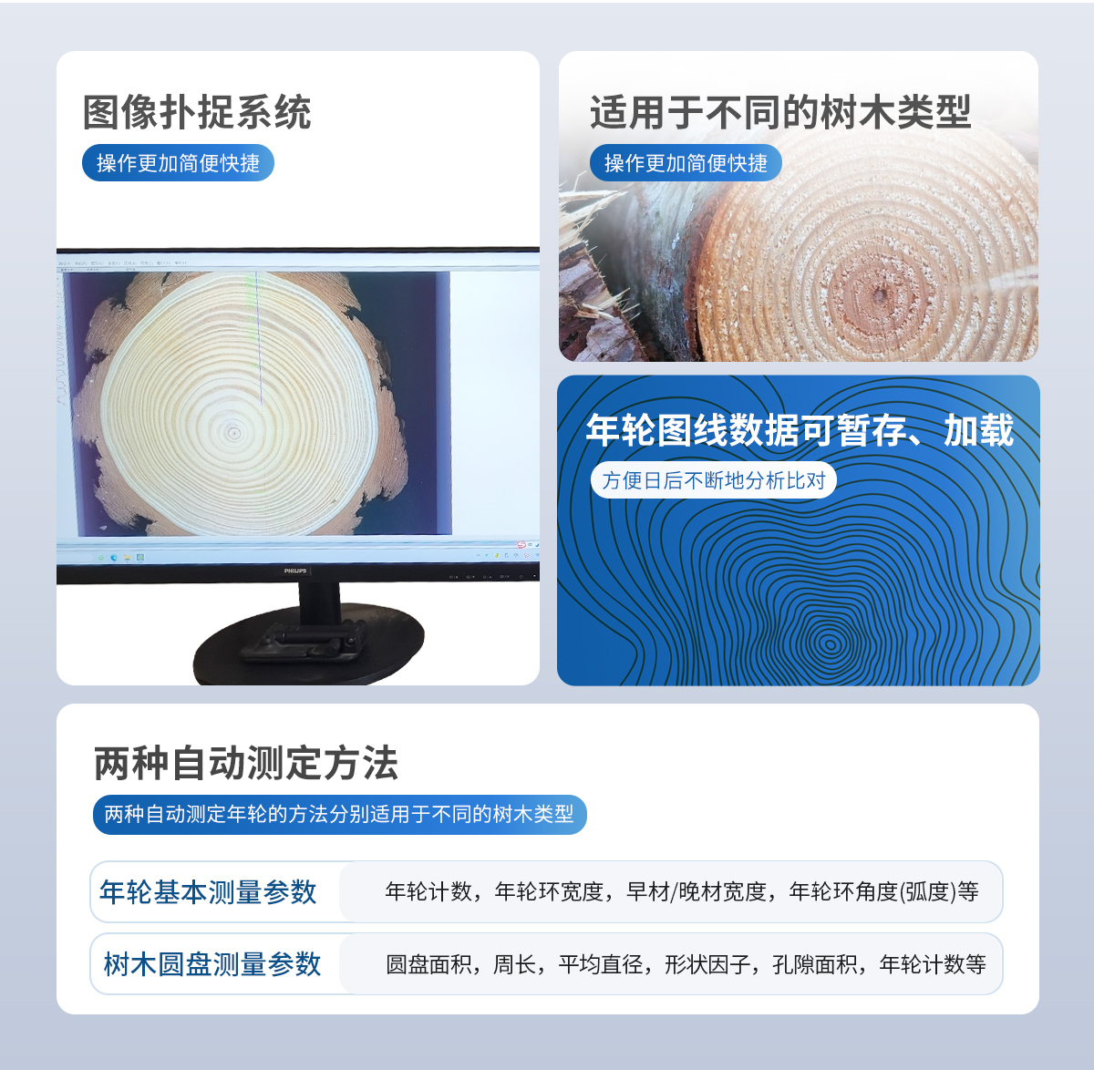 1、水平或垂直方向測(cè)量年輪、沿直線方向測(cè)量年輪(單節(jié))、年輪寬度測(cè)量、自動(dòng)年輪監(jiān)測(cè)方式(強(qiáng)度不同)、忽略缺口部分、邊材寬度測(cè)量、估算丟失的年輪、以各種方向測(cè)量年輪、測(cè)量復(fù)雜形狀的樣品年輪(多節(jié))、添加相關(guān)年輪、早材晚材寬度測(cè)量、每環(huán)的反射光測(cè)量(**值、*小值、平均值、方向)、存儲(chǔ)*后部分年輪、可自定義一些參數(shù)(例如:名字、類(lèi)型等)、圖像編輯、批量分析。 2、植物年輪測(cè)量分析: (1)可自動(dòng)判讀年輪數(shù)、各年輪平均寬度、早材及晚材寬度、各年輪切向角度和面積、可自動(dòng)劃分出年輪邊界、早材邊界、晚材邊界,以及識(shí)別出很窄的樹(shù)輪。可交互刪除偽年輪、插入斷年輪,亦可分析樹(shù)木圓盤(pán)面積,周長(zhǎng),平均直徑,形狀因子,孔隙面積,年輪技術(shù)等。 (2)可自動(dòng)生成國(guó)際上通行的分析年表。分析獲得的測(cè)量數(shù)據(jù)具備進(jìn)一步做交叉定年、數(shù)據(jù)分析處理能力。 (3)具有年輪圖線數(shù)據(jù)暫存、加載特性,以便日后不斷地分析比對(duì)。 (4)具有精細(xì)分析的“軟件體視鏡”特性。有路徑端點(diǎn)吸附定位特性,對(duì)不滿意的分析路徑還可斷開(kāi)、刪除、增加與編輯,以及可將分析結(jié)果圖線保存。 (5)圖線上調(diào)整角度具有跟隨特性,畫(huà)路徑的時(shí)候可取消或刪除。可直接分析達(dá)到1GB超高精度掃描的年輪圖像。具有對(duì)年輪寬度<0.2mm的極精細(xì)年輪的自動(dòng)分析能力。 (6)可計(jì)算樹(shù)盤(pán)總面積。可保存或讀取TIFF、BMP、PNG、JPEG標(biāo)準(zhǔn)格式的圖像。 3、系統(tǒng)自帶標(biāo)定功能、XY向可分別標(biāo)定修正。具有跟隨放大鏡功能,通過(guò)鼠標(biāo)拖動(dòng)**測(cè)量。圖像可放大縮小和局部觀察,可實(shí)現(xiàn)鼠標(biāo)區(qū)域選擇統(tǒng)計(jì)。分析圖像、分布圖、結(jié)果數(shù)據(jù)可保存,分析結(jié)果輸出至Excel表,可輸出分析標(biāo)記圖。