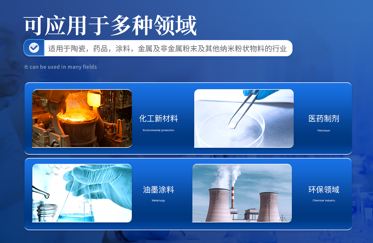 陶瓷,藥品,乳液,涂料染料,顏料,化工產品,催化劑,鉆井泥漿,磨料,潤滑劑,煤粉,粉塵,細胞,細菌,食品,農藥,石墨,石墨烯,硅溶膠,模式,金屬及非金屬粉末及其他納米粉狀物料的行業。
