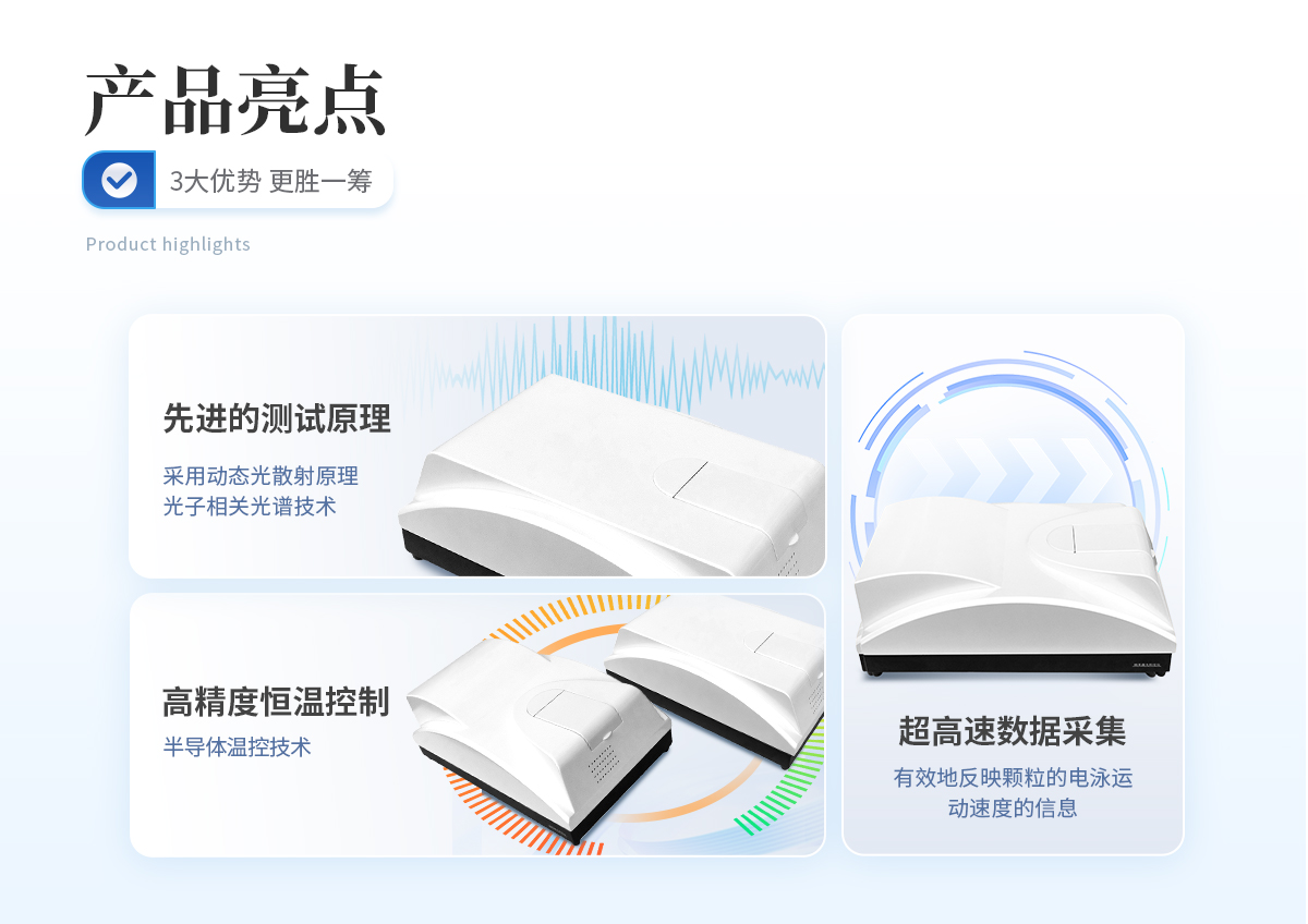 雙波長激光器,全自動切換 獨家采用雙波長(λ= 405nm、λ= 532nm)激光器搭建而成的光路系統,相關譜探測系統不僅體積小,而且具有很強的抗干擾能力,從而保證了測試的穩定性;對某些具有吸光屬性,傳統單一波長激光器無法檢測的樣品,可進行有效檢測; | **的測試原理 采用動態光散射原理和光子相關光譜技術,根據顆粒在液體中的布朗運動速度測定顆粒大小。大小顆粒運動速度不同,激光照射這些顆粒,不同大小的顆粒將使散射光發生快慢不同的漲落起伏。光子相關光譜法就根據特定方向的光子漲落起伏分析其顆粒大小。 | 超高速數據采集 使用PCS技術測定納米級顆粒大小,必須能夠分辨納秒級信號起伏。本儀器的核心部件采用我公司研制的CR256數字相關器,具有識別8ns的**分辨能力和**的信號處理速度,其數據處理速度高達162M。它能實時完成動態散射光強的采集和自相關函數運算,從而有效地反映不同大小顆粒的動態分光散射信息,為測試結果的準確性典型基礎。 | 高靈敏度和信噪比 采用專業級高性能光電倍增管,對光子信號具有**的靈敏度和信噪比。 | 高精度雙溫控保護系統 采用半導體溫控技術,樣品池溫控系統和激光器溫控系統精度高達±0.1℃,使被測樣品和激光器光源在整個測試過程中都處于恒溫狀態,避免溫度變化對不測試結果的影響,確保測試準確和重復; | 穩定的光路系統 采用光纖技術搭建而成的光路系統,使光子相關譜探測系統不僅體積小,而且具有很強的抗干擾能力,從而保證了測試的穩定性。 |