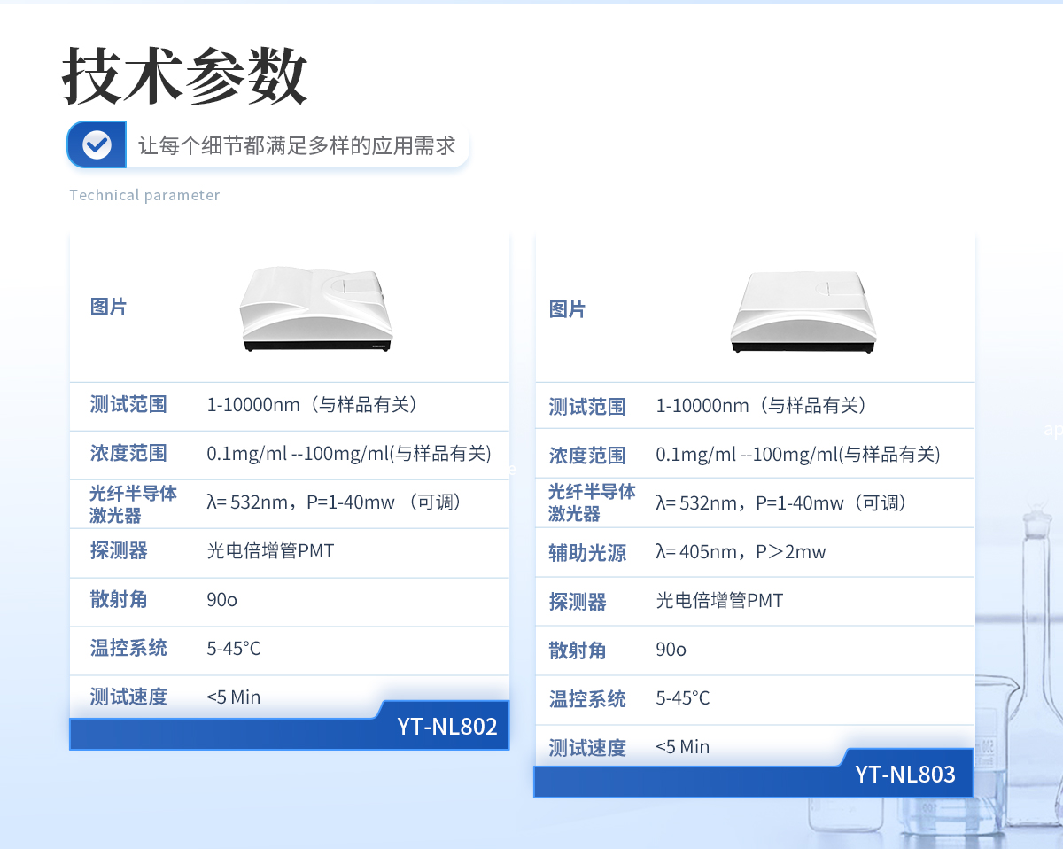 規格型號:YT-NL803 | 執行標準:GB/T 19627-2005/ISO 13321-1996 GB/T 29022-2012/ISO 22412-2008 | 測試范圍 :1-10000nm(與樣品有關) | 濃度范圍:0.1mg/ml--100mg/ml(與樣品有關) | 準確度誤差:<1%(國家標準樣品d50值)> | 重復性誤差:<1%(國家標準樣品d50值)> | 激光光源:光纖半導體激光器,λ= 532nm,P=1-40mw(可調) 輔助激光器,λ= 405nm,P>2mw | 探測器:光電倍增管PMT | 散射角:90o | 樣品池體積:10mm*10mm*40mm, 1--4mL | 溫控范圍:5-45℃ | 溫控精度:0.1℃ | 測試速度:<5 min=""> | 數字相關器主要參數: (1)規格型號 CR256 (2)自相關通道 256 (3)基線通道 4 (4)物理通道數 5000 (5)延遲時間 100ns-10ms(可調) | 體積:480mm*270mm*170mm | 重量:12Kg |
