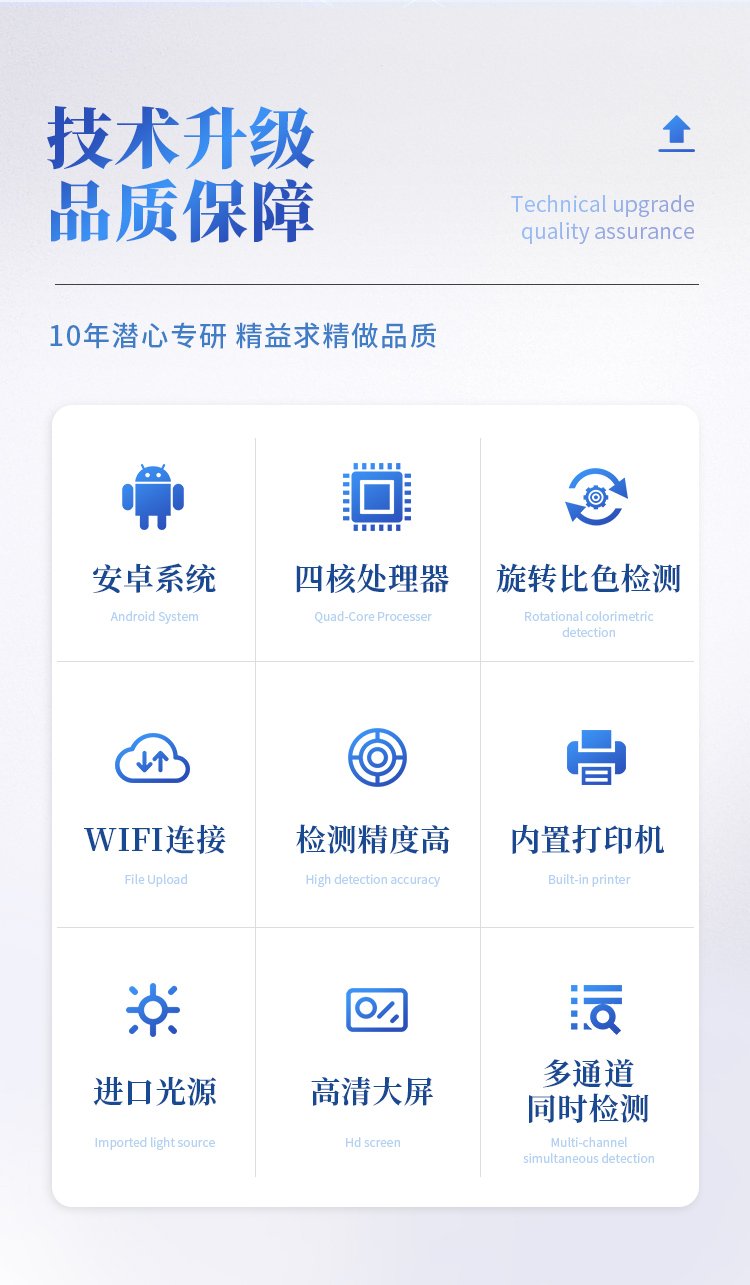 機器采用全新安卓智能系統,主控芯片采用 ARM Cortex-A7,RK3288/4核處理器,主頻1.88Ghz,運轉速度更快速,穩定性更強。 | 創新檢測模式: *儀器采用精密旋轉比色池設計,使用光源一致,可以解決各通道間由于光源誤差帶來的檢測結果誤差問題,檢測結果更加精準。 *儀器具有自動識別比色皿檢測功能,即:將樣品比色皿放入儀器后,點擊樣品檢測,儀器自動識別比色皿進行通道檢測。 | 供電方式:交直流兩用,直流 12V 供電,可連接車載電源,可配 6ah 大容量充電鋰電池,方便戶外流動測試。 | 顯示方式:7英寸液晶觸摸屏顯示,人性化中文操作界面,讀數直觀、簡單。 | 檢測通道:12個檢測通道,可以同時測試多個樣品,循環檢測,即放即檢,每個樣品由程序控制分別獨立工作,不會互相干擾。 | 高精光源系統: ①儀器光源采用進口超高亮發光二極管,光源亮度可以自動調節與校準 ②智能恒流穩壓,光強自動校準,長時間連續工作光源無溫漂現象。 | 智能操作分析系統: ①儀器具有100多種蔬菜名稱菜單庫,分類管理,并可按需添加或刪除、編輯蔬菜名稱;可在同一檢測界面自動對應相關檢測通道一次性選擇1-24個樣品名稱,無需退出界面,節省操作時間。 ②內置新國家限量標準,與所測結果進行現場比對,并持續更新標準。 | 完善的配套硬件: ①采用串口5v打印機,可選擇手動打印或者自動打印,三分鐘出打印結果,打印格式為檢測人姓名、吸光度差值、檢測時間、檢測機構、樣品名稱及結果判定。 ②儀器具有無線上傳模塊,檢測結果可批量打印,批量上傳。 | 數據調用: ①儀器可存儲20萬條檢測結果, ②檢測結果為Excel表格,方便后期進行數據分析與匯總報告 ③儀器采用USB2.0接口設計,支持 U 盤存儲,方便數據的存貯和移動,并可隨時與計算機直接相連,實現數據查詢、瀏覽、分析、統計、打印等。 | 后期產品固件可升級。 | 安全證書,放心保障:儀器具有中國計量科學研究院校準證書,權威認證,使用放心。 | 機箱采用工業級ABS工程塑料箱,方便攜帶,穩固耐用,便于流動測試。 |