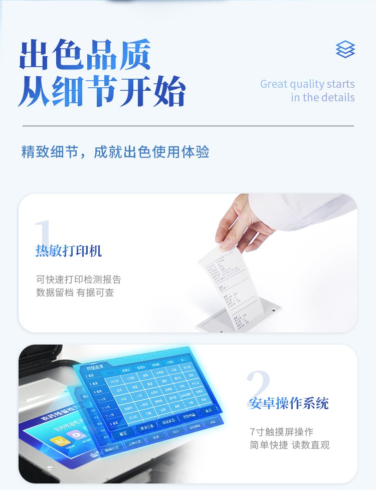 安卓智能操作系統,采用更加**和人性化操作,儀器具有無線聯網上傳功能,快速上傳數據,進行數據統計和分析。 | 智能化程度高,儀器具有自檢功能:具有開機自檢和調零功能,具有自動檢測重復性功能;同時,檢測完成可自動打印檢測報告和二維碼。手機掃碼可顯示出詳細檢測信息。 | 儀器帶有監管平臺,數據可局域網和互聯網數據上傳,檢測結果直接傳至食品安全監管平臺。進行區域食品安全監管及大數據分析處理與數據統計,檢測區域食品安全長短期動態,達到食品安全問題預估、預警 。 | 樣品處理簡單省力,整體操作快速、安全、便捷。 | 儀器具有自身保護功能,可設置用戶名及密碼,防止非工作人員操作等。 | 內置強大的數據庫,可在儀器上直接選擇樣品名稱、檢測指標、送檢單位等信息,也可在儀器上直接編輯錄入樣品名稱、檢測指標、送檢單位等信息并保存進樣品數據庫,方便后期操作調取使用。 | 儀器具有重新校準、鎖定、恢復出廠設置功能。 |