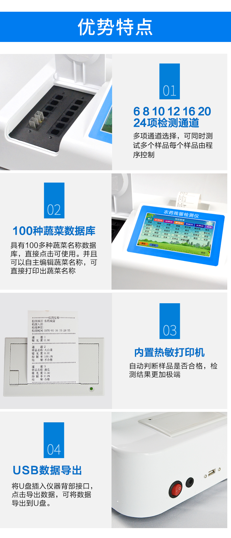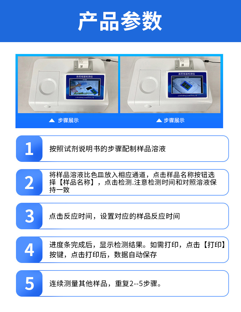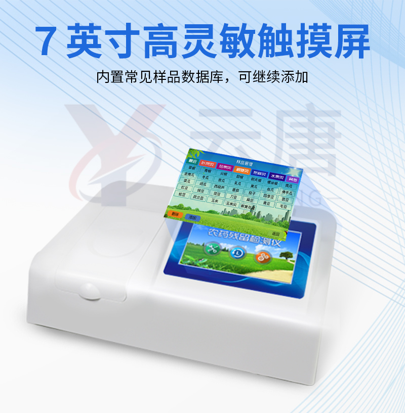 乙酰膽堿酯酶和丁酰膽堿酯酶試劑均可以使用,符合國家標準和農(nóng)業(yè)部標準的要求。 | 自動判斷樣品是否合格,檢測結果更加直觀。 | 儀器具有100多種蔬菜名稱菜單庫,分類管理,并可按需添加或刪除蔬菜名,編輯蔬菜名稱,可直接打印出蔬菜名稱。 | 檢測通道:10個檢測通道,可以同時測試多個樣品,循環(huán)檢測,即放即檢,每個樣品由程序控制分別獨立工作,不會互相干擾。 | 智能操作系統(tǒng),采用更加人性化操作,主控采用多核處理器,主頻1.88Ghz,運轉速度更快速,穩(wěn)定性更強。 | 顯示方式:7英寸高靈敏真彩觸摸屏顯示,人性化中文操作界面,讀數(shù)直觀、簡單。 | 打印機采用串口5v打印,可選擇手動打印或者自動打印,三分鐘出打印結果,打印格式為檢測人姓名、吸光度差值、檢測時間、檢測機構、樣品名稱及結果判定。 | 光源采用進口超高亮發(fā)光二極管,具有低功耗、高精度、穩(wěn)定性強、光源可控可以關掉不使用的光源,響應速度快等優(yōu)點。 | 智能恒流穩(wěn)壓,光強自動校準,長時間連續(xù)工作光源無溫漂現(xiàn)象。 | 儀器具有GPRS遠傳功能,可插手機卡實現(xiàn)數(shù)據(jù)遠傳平臺,wifi聯(lián)網(wǎng)功能,可將數(shù)據(jù)快速上傳電腦,進行數(shù)據(jù)管理與統(tǒng)計。 | 采用USB2.0接口設計,方便數(shù)據(jù)的存貯和移動,并可隨時與計算機直接相連,并且可用計算機控制儀器。實現(xiàn)數(shù)據(jù)查詢、瀏覽、分析、統(tǒng)計、打印等。 | 智能化程度高,儀器具有自檢功能:具有開機自檢和調(diào)零功能,具有自動檢測重復性功能 | 儀器具有自身保護功能,可設置用戶名及密碼,防止非工作人員操作等。 | 采用DC12v直流供電,安全系統(tǒng)更高,并且配備6A鋰電池充電器。 | 儀器具有重新校準、鎖定、恢復出廠設置功能。 |
