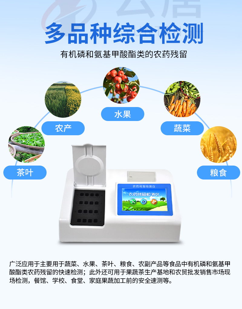 廣泛應用于主要用于蔬菜、水果、茶葉、糧食、農(nóng)副產(chǎn)品等食品中有機磷和氨基甲酸酯類農(nóng)藥殘留的快速檢測;此外還可用于果蔬茶生產(chǎn)基地和農(nóng)貿(mào)批發(fā)銷售市場現(xiàn)場檢測,餐館、學校、食堂、家庭果蔬加工前的安全速測等。