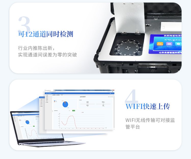 安卓智能操作系統,采用更加**和人性化操作,儀器具有無線聯網上傳功能,快速上傳數據,進行數據統計和分析。 | 智能化程度高,儀器具有自檢功能:具有開機自檢和調零功能,具有自動檢測重復性功能;同時,檢測完成可自動打印檢測報告和二維碼。手機掃碼可顯示出詳細檢測信息。 | 儀器帶有監管平臺,數據可局域網和互聯網數據上傳,檢測結果直接傳至食品安全監管平臺。進行區域食品安全監管及大數據分析處理與數據統計,檢測區域食品安全長短期動態,達到食品安全問題預估、預警 。 | 樣品處理簡單省力,整體操作快速、安全、便捷。 | 儀器具有自身保護功能,可設置用戶名及密碼,防止非工作人員操作等。 | 內置強大的數據庫,可在儀器上直接選擇樣品名稱、檢測指標、送檢單位等信息,也可在儀器上直接編輯錄入樣品名稱、檢測指標、送檢單位等信息并保存進樣品數據庫,方便后期操作調取使用。 | 儀器具有重新校準、鎖定、恢復出廠設置功能。 |