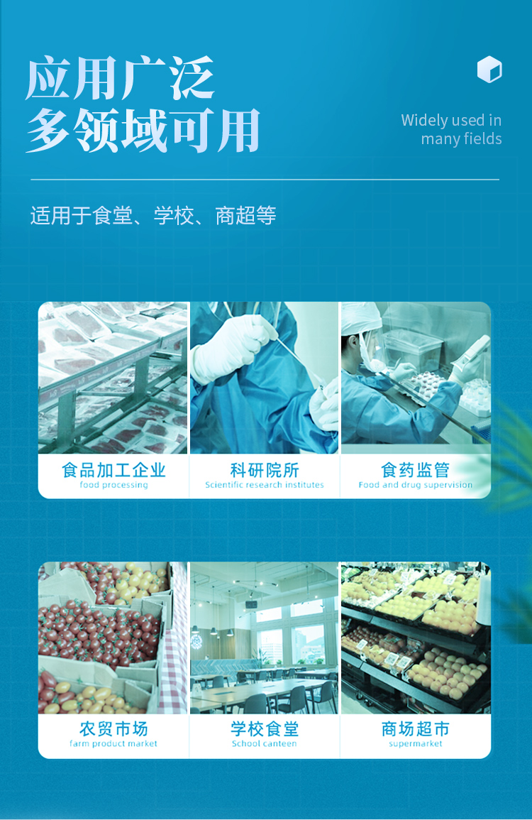 廣泛應(yīng)用于主要用于蔬菜、水果、茶葉、糧食、農(nóng)副產(chǎn)品等食品中有機(jī)磷和氨基甲酸酯類農(nóng)藥殘留的快速檢測;此外還可用于果蔬茶生產(chǎn)基地和農(nóng)貿(mào)批發(fā)銷售市場現(xiàn)場檢測,餐館、學(xué)校、食堂、家庭果蔬加工前的安全速測等。