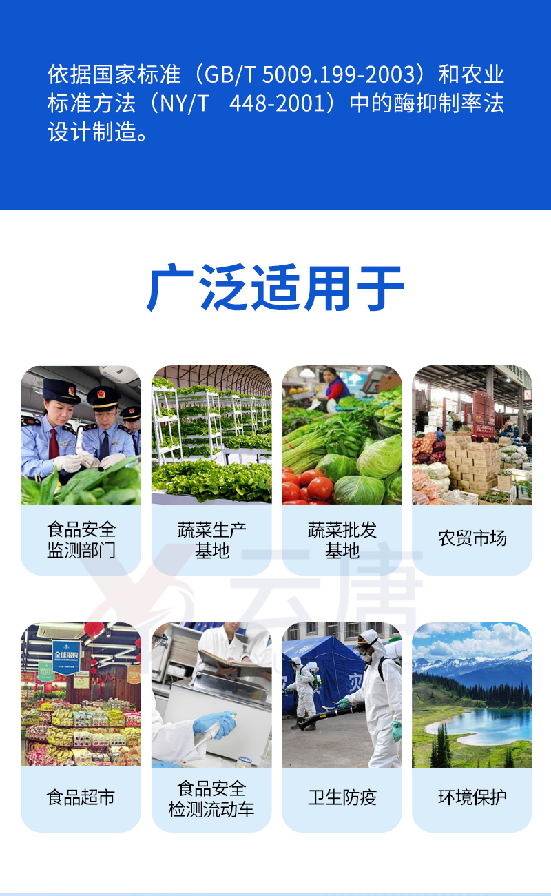 該儀器依據國家標準(GB/T 5009.199-2003)和農業標準方法(NY/T 448-2001)中的酶抑制率法設計制造,能準確、快速檢測出蔬菜、水果、農產品、茶葉等固體或液體中有機磷和氨基甲酸酯類農藥殘留量。廣泛適用于各級食品安全監測部門、蔬菜生產基地、蔬菜批發基地、農貿市場、食品超市、各單位食堂、食品安全檢測流動車、衛生防疫、環境保護等領域。