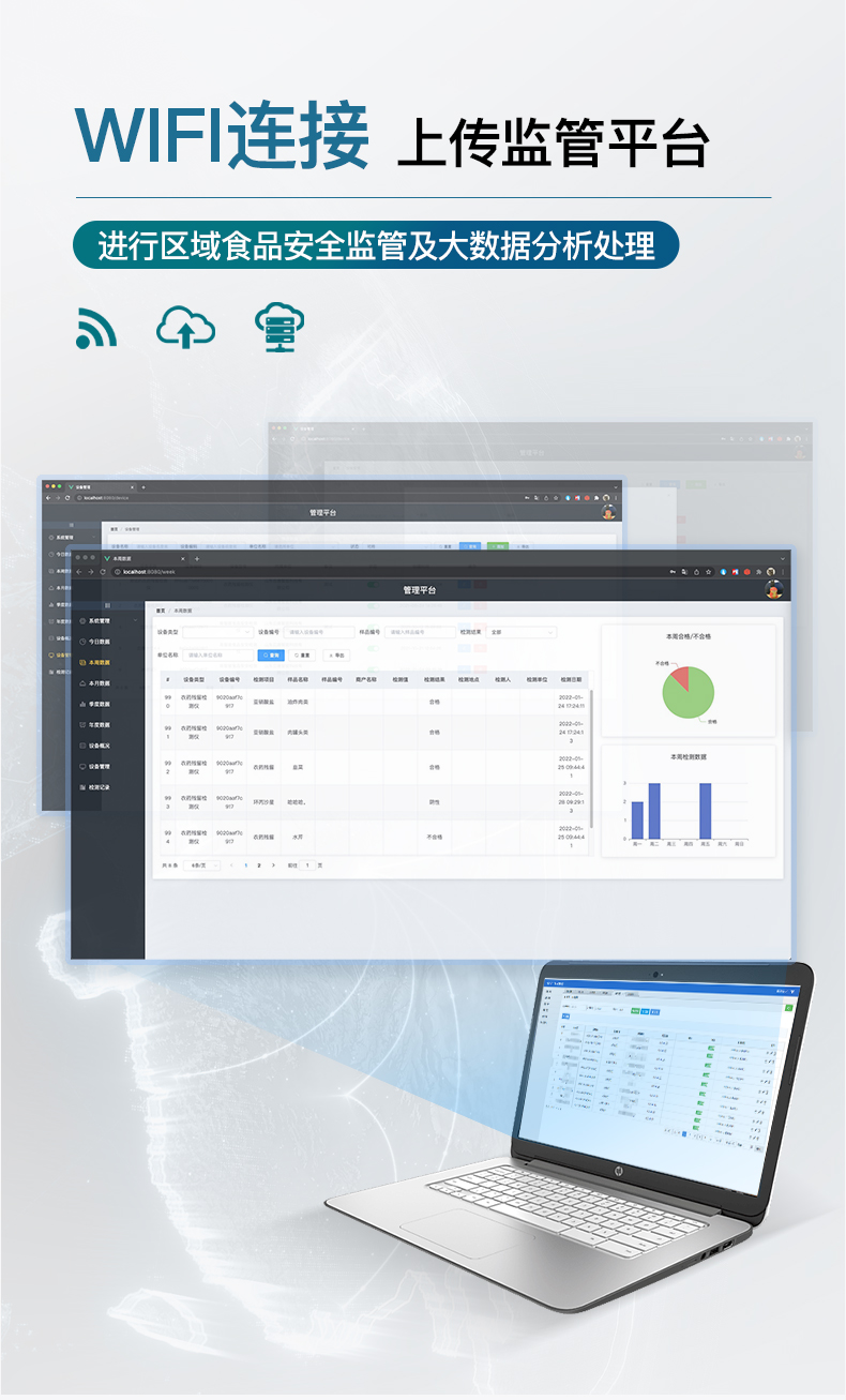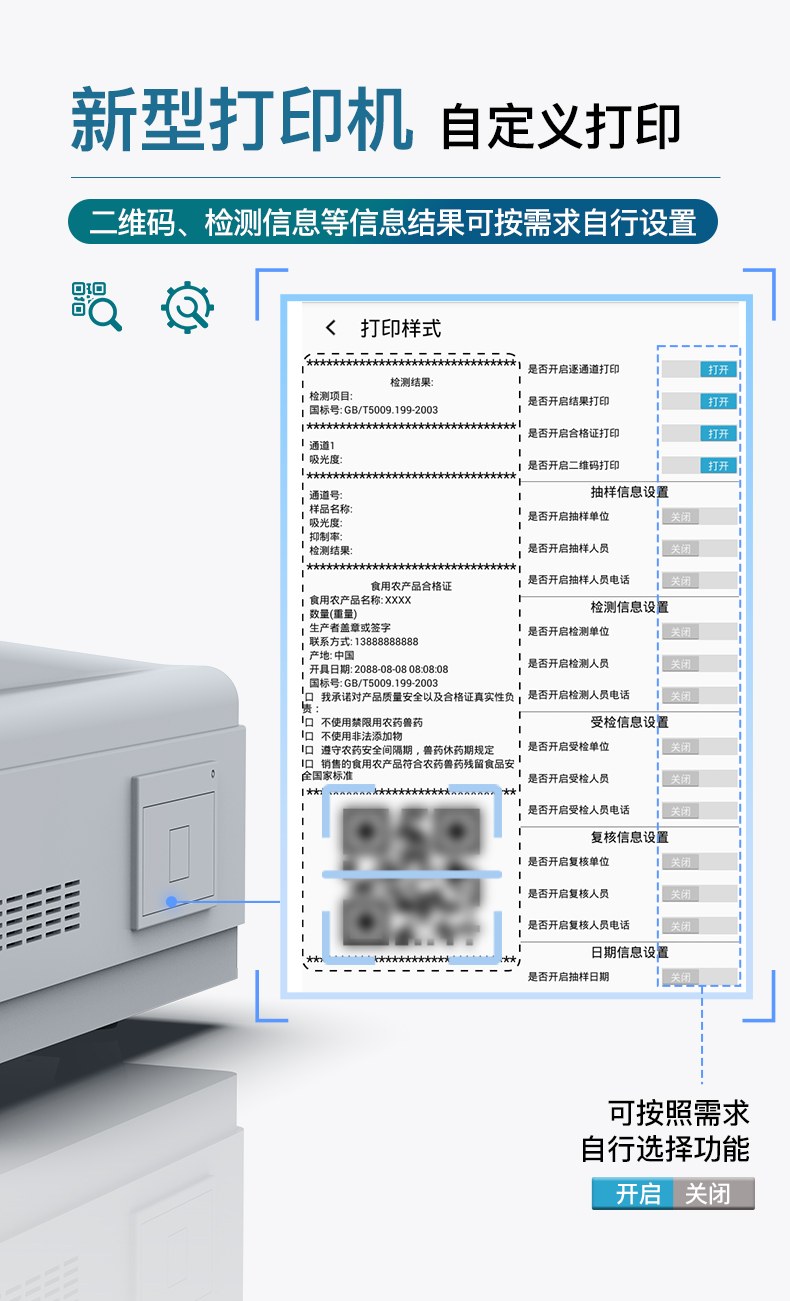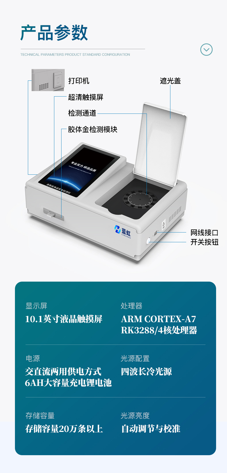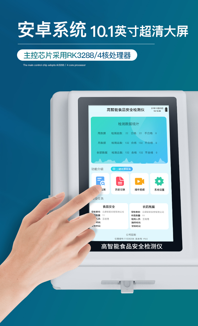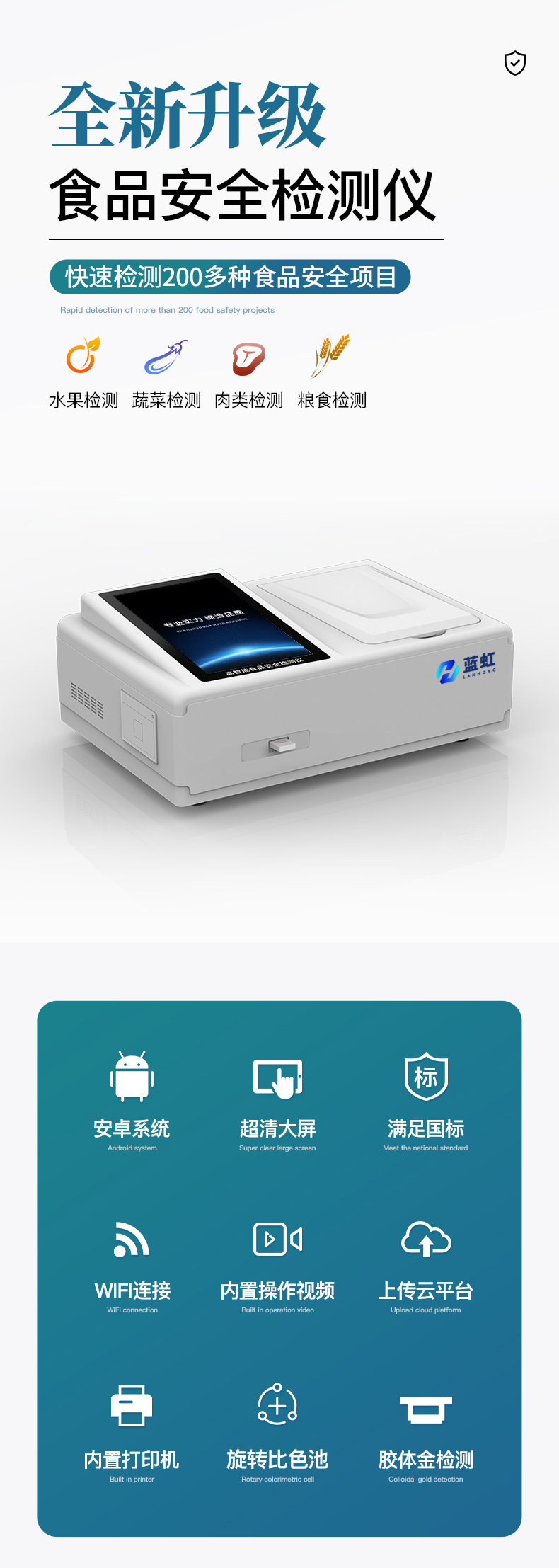 儀器采用手提式一體化系統(tǒng)檢測技術,將分光光度模塊、數字化管理模塊、無線通訊模塊高度集成于一體,支持檢測200種食品安全檢測項目,同時預留升級檢測方法。 | 儀器檢測模塊標準化、智能化,檢測項目可隨意自由組合。檢測箱體內置多個標準檢測單元,檢測模塊可以調整配置。 | 顯示屏幕:儀器采用10.1英寸豎向液晶觸摸屏顯,搭配運行安卓智能操作系統(tǒng),主控芯片采用ARM Cortex-A7,RK3288/4核處理器,主頻1.88Ghz,操作方便,性能更強。 | 檢測通道:≥12通道;采用精密旋轉比色池設計,使用同芯片同光源校準精度,解決不同光源之間的誤差值,更加準確**。(1-12通道間誤差0.1%,***:**202022821055.2) | 儀器光源:高精度進口四波長冷光源,每個通道均配置 410、520、590、630nm 波長光源,標配**的光路切換裝置,專利光路切換功能可實現64波長,并且所有檢測項目可實現所有通道同時檢測。 | 設備可一鍵校準,自動保存校準數據,自動對比校驗,得到精準光源,采用Android SP存儲數據,光源數據永不丟失,方便每一次使用。 | 通訊接口:配備無線通信模塊、可選配4G(APN)通訊模塊和藍牙傳輸,同時具有雙USB接口以及RJ45網線接口,可以多方式實現數據保存及數據傳輸。 | 存儲方式:支持U盤存儲,標準USB接口,免驅動安裝。檢測結果存儲容量20萬條以上,可生成Excel表格進行拷貝,并具有登錄保護功能。 | 智能化操作系統(tǒng): | 1)操作系統(tǒng):儀器可在同一檢測界面自動對應相關檢測通道,一次性選擇1-12個樣品名稱,無需退出界面,節(jié)省操作時間。并可以對每個通道屬性和樣品信息單獨進行編輯,例如送檢單位、人員,檢測人員等,打印時勾選打印顯示。 | 2)數據集成系統(tǒng):設備首頁自動匯總分析檢測數據,包含:周檢測數據、月檢測數據,全部檢測總數量,均包含檢測總數,合格數,不合格數,以及相關柱形分析圖,各項檢測數據一目了然,無需電腦查詢,更加快捷直觀。 | 3)數據庫系統(tǒng):十幾項數據庫分類管理儀器:包含項目類型、項目數據、檢測數據、歷史記錄、國標信息、曲線信息、采樣信息、檢測信息、受檢信息、復核信息、圖表信息、光源校準信息、打印樣式信息、樣品庫信息等等,數據庫之間互相協調聯動保證數據的真實完整性。同時產品數據庫以及歷史檢測記錄支持一鍵檢索功能。 | 4)限量規(guī)判系統(tǒng):具有限量查詢、添加物質合規(guī)判定系統(tǒng)。檢測出結果后,系統(tǒng)自動調用系統(tǒng)數據庫中相關國標進行比對判定,客觀顯示判定結果是否合格。 | 5)項目預設系統(tǒng):儀器具有任務預設模塊,一鍵提前預設,給出方便快捷的新檢測方案,每一個任務分別可以設置不同的樣品、批次、編號、來源、備注、抽樣信息、檢測信息、受檢信息、復核信息等更多信息。樣品送檢時一鍵調取保存信息,并可多次調取,大大提高檢測效率。 | 6)數據監(jiān)管系統(tǒng):同步對接監(jiān)管平臺,數據可局域網和互聯網數據上傳,檢測結果可選擇直接傳至食品安全監(jiān)管平臺。進行區(qū)域食品安全監(jiān)管及大數據分析處理與數據統(tǒng)計,檢測區(qū)域食品安全長短期動態(tài),達到食品安全問題預估、預警。 | 7)打印系統(tǒng):內置全新打印機,新創(chuàng)自定義打印方式,可按需靈活勾選控制:產品合格證(國家農業(yè)部標準要求),二維碼,抽樣信息、檢測信息,受檢信息、復核信息、抽樣日期、檢測日期等信息的打印。 | 供電模式:儀器交直流兩用,直流12V供電,可連接車載電源,可配6ah大容量充電鋰電池,電量可實時顯示,方便戶外流動測試。 | 儀器加入遠程升級功能,可定向分客戶分儀器更新,開機后自動更新,客戶無需任何操作,即可升級全新項目。做到了無需退換機器即可實現實時遠程升級檢測儀器。 | 設備尺寸:(長*寬*高)440*300*180mm | 儀器加入遠程升級功能,可定向分客戶分儀器更新,開機后自動更新,客戶無需任何操作,即可升級全新項目。做到了無需退換機器即可實現實時遠程升級檢測儀器。 |