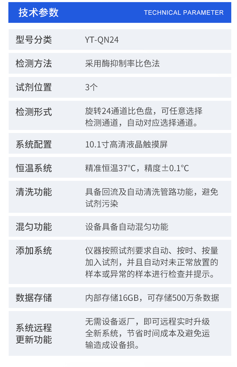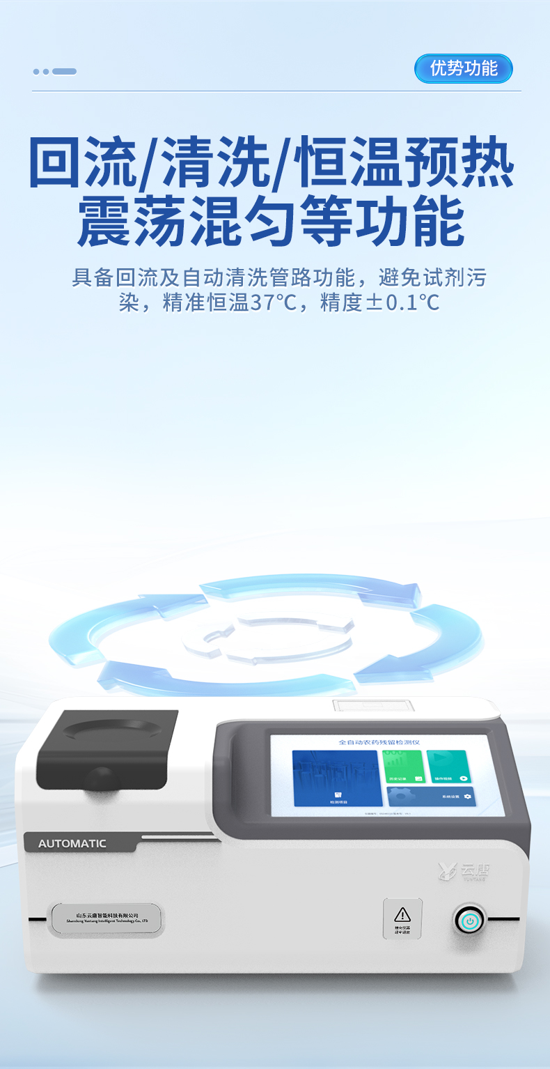 1. 試劑位置:3個 | 2. 檢測形式:旋轉24通道比色盤,可任意選擇檢測通道,自動對應選擇通道。 | 3. 系統配置:10.1寸高清液晶觸摸屏,采用ARM Cortex?-A7,RK3288/4核處理器,運行內存1GB。Android7.1.1 系統分辨率1280×800。 | 4.恒溫系統:具有自動加溫溫控系統,精準恒溫37℃,精度±0.1℃。 | 5.添加系統:儀器按照試劑要求自動、按時、按量加入試劑,并且自動對未正常放置的樣本或異常的樣本進行檢查并提示。 | 6.清洗功能:儀器具備回流及自動清洗管路功能,避免試劑污染。 | 7.混勻功能:設備具備自動混勻功能。 | 8.光源校準:設備可自動校準,確保檢測準確度。 | 9.實時監控:儀器測試過程中屏幕顯示運行狀態,可實時查看。 | 10.數據存儲:內部存儲16GB,可存儲500萬條數據。 | 11.樣品多選功能:設備具備樣品一鍵多選功能,選擇樣品自動匹配檢測通道。 | 12.項目預設:可提前設置單個及多個相同或不相同的檢測任務,可單次或者多次調取,減少檢測時間。 | 13.自定義打印系統:內置自定義打印系統,可按需靈活設置開啟或關閉:產品合格證(國家農業部標準),二維碼,抽樣信息、檢測信息,受檢信息等信息的打印。 | 14.A4版本報告打印功能:設備可自動生成A4版報告,A4報告帶二維碼,可掃描二維碼生成電子版,并可識別真偽。 | 15.傳輸方式:儀器配備無線通信模塊: 4G(APN)通訊模塊、Wifi模塊,藍牙傳輸模塊,同時具有USB接口以及RJ45接口能以多種方式實現數據保存和數據傳輸功能,設備數據可以同步上傳至平臺。 | 16.數據監管系統:設備自帶監管平臺,并可同步對接監管平臺,數據可局域網和互聯網數據上傳,檢測結果可直接傳至食品安全監管平臺。達到食品安全問題預估、預警。 | 17.系統遠程更新功能:無需設備返廠,即可遠程實時升級全新系統,節省時間成本及避免運輸造成設備損。 |