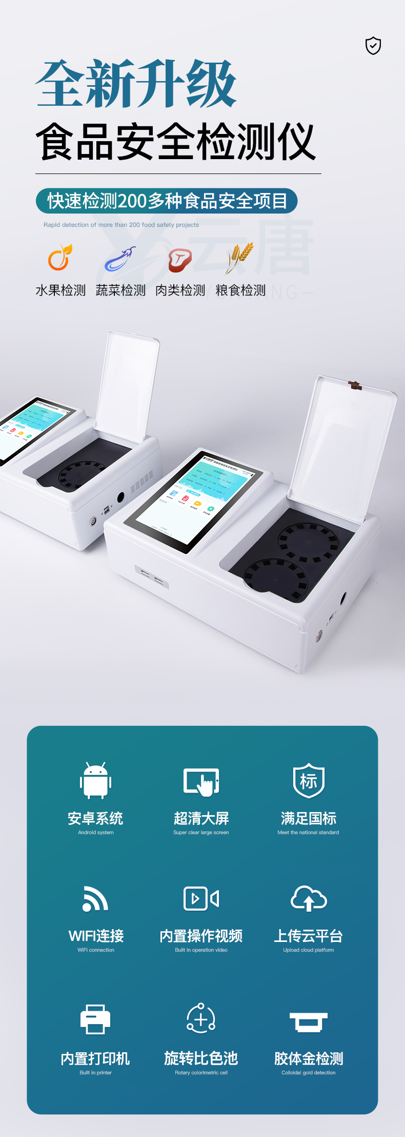 1、儀器采用臺式一體化系統檢測技術,將分光光度模塊、數字化管理模塊、無線通訊模塊高度集成于一體,支持檢測200種食品安全檢測項目,同時預留升級檢測方法。