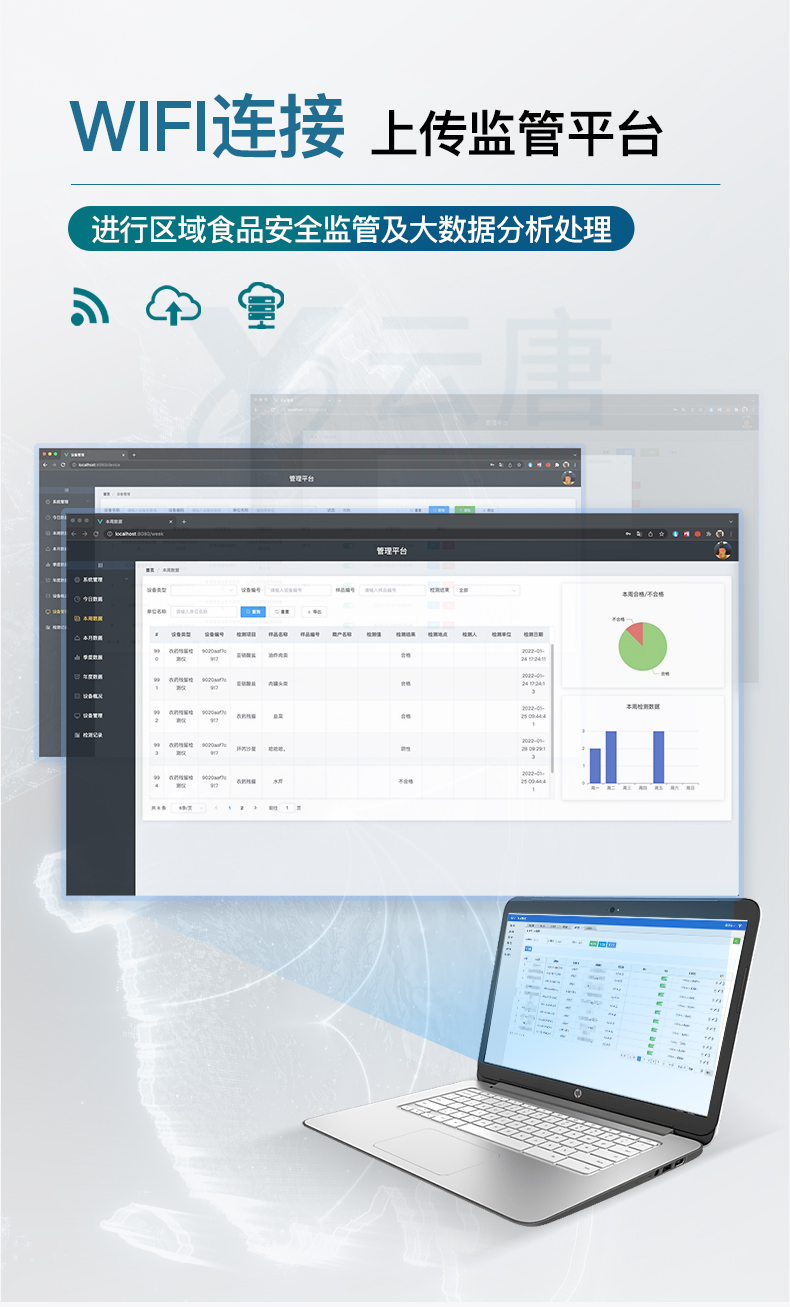 9.6、數(shù)據(jù)監(jiān)管系統(tǒng):同步對(duì)接監(jiān)管平臺(tái),數(shù)據(jù)可局域網(wǎng)和互聯(lián)網(wǎng)數(shù)據(jù)上傳,檢測(cè)結(jié)果可直接傳至食品安全監(jiān)管平臺(tái)。進(jìn)行區(qū)域食品安全監(jiān)管及大數(shù)據(jù)分析處理與數(shù)據(jù)統(tǒng)計(jì),監(jiān)測(cè)區(qū)域食品安全長(zhǎng)短期動(dòng)態(tài)及問題預(yù)估、預(yù)警。