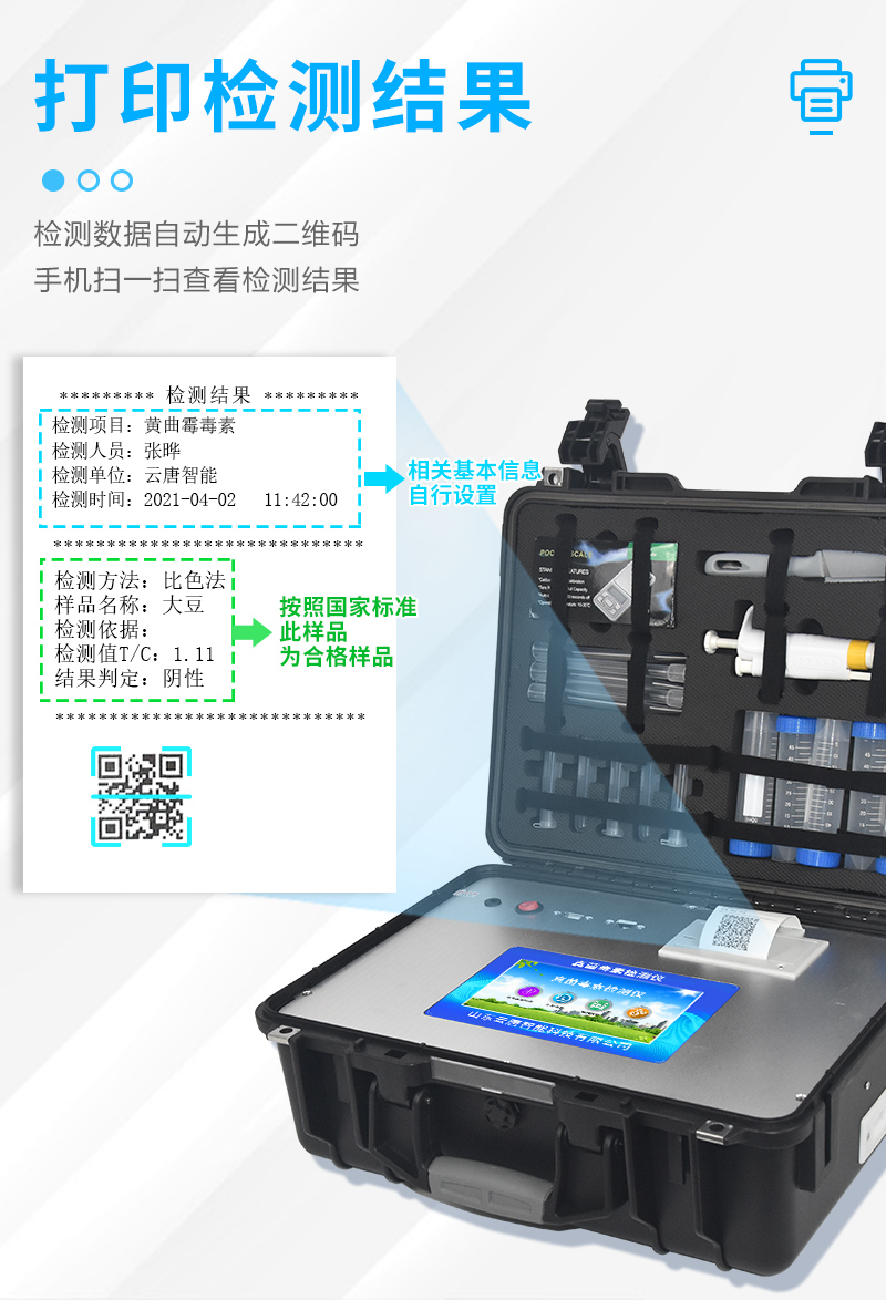 7、新一代高速熱敏打印機,檢測完成可自動打印檢測報告和二維碼。打印報告包含被測物質、合格不合格、檢測單位、被檢查單位、檢驗員、檢測時間。