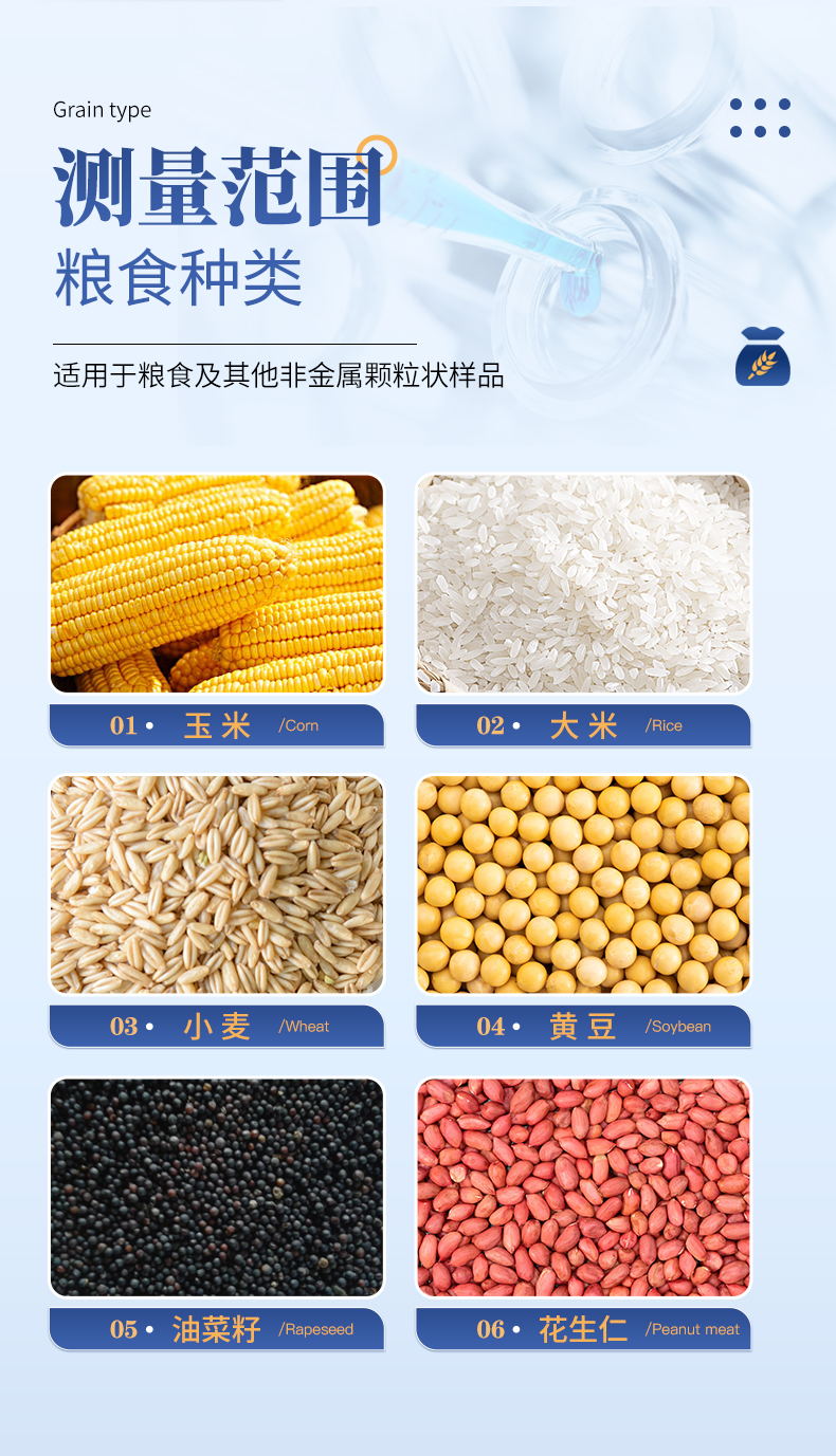 測量范圍:可測量谷類、玉米、東北玉米、大麥、小麥、白小麥、大米、豆粕、花生仁、菜粕、高粱、黑芝麻、棉籽、棉粕、秈谷、大豆、油菜籽、飼料、蔬菜種子等非金屬顆粒狀物質(zhì)。