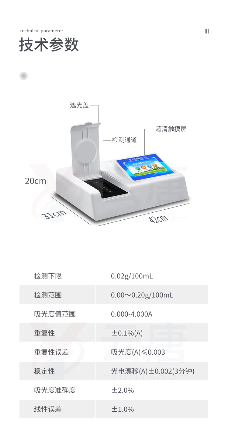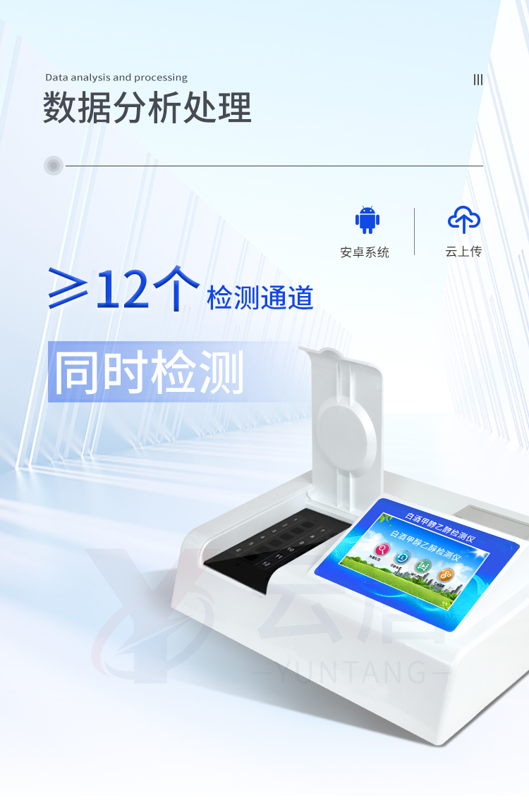 1、 檢測項目:可快速檢測各類食品中的甲醛的含量,儀器預留其他項目檢測程序和端口,根據(jù)日后需求可方便的自主增加檢測項目。日后可升級為檢測,水產品,肉制品,面制品的綜合類型儀器。