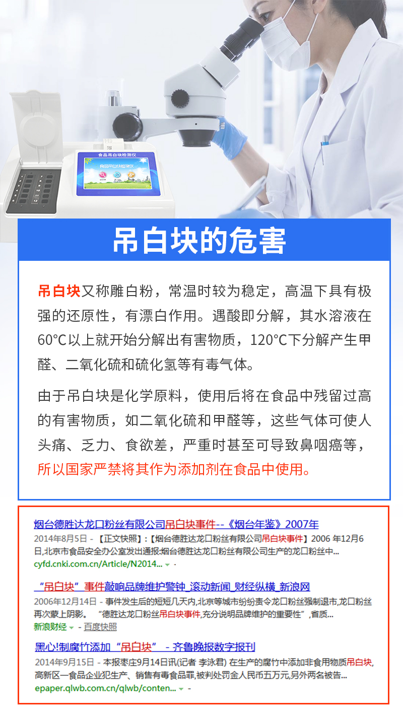 1、 檢測項目:用于快速檢測食品中吊白塊,儀器預留其他項目檢測程序和端口,根據日后需求可方便的自主增加檢測項目。日后可升級為檢測,水產品,肉制品,面制品的綜合類型儀器。
