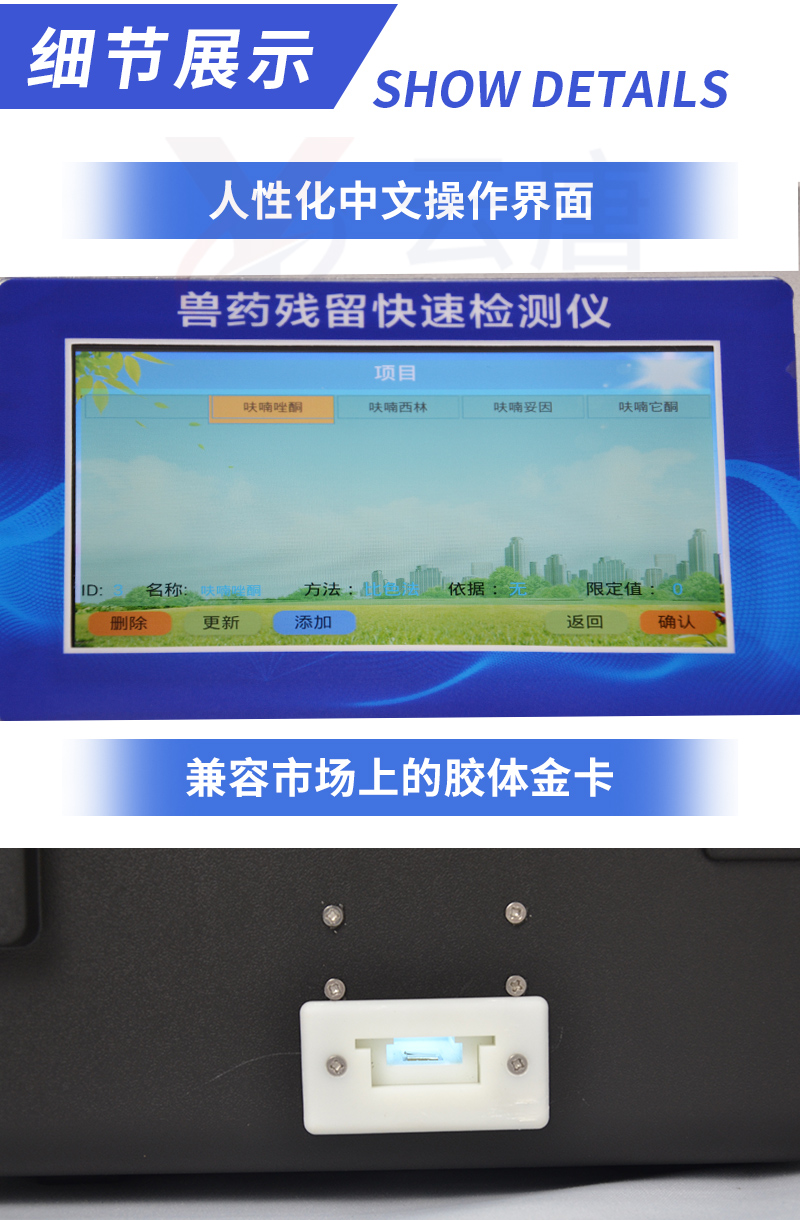 該獸藥殘留檢測儀適用于豬、雞、鴨、羊、牛、牛奶等畜禽肉產(chǎn)品中獸藥殘留,包括抗生素類殘留、瘦肉精激素類殘留和水產(chǎn)品有毒有害物質(zhì)的現(xiàn)場快速篩查定及性定量檢測。