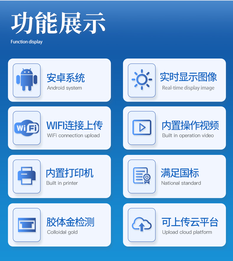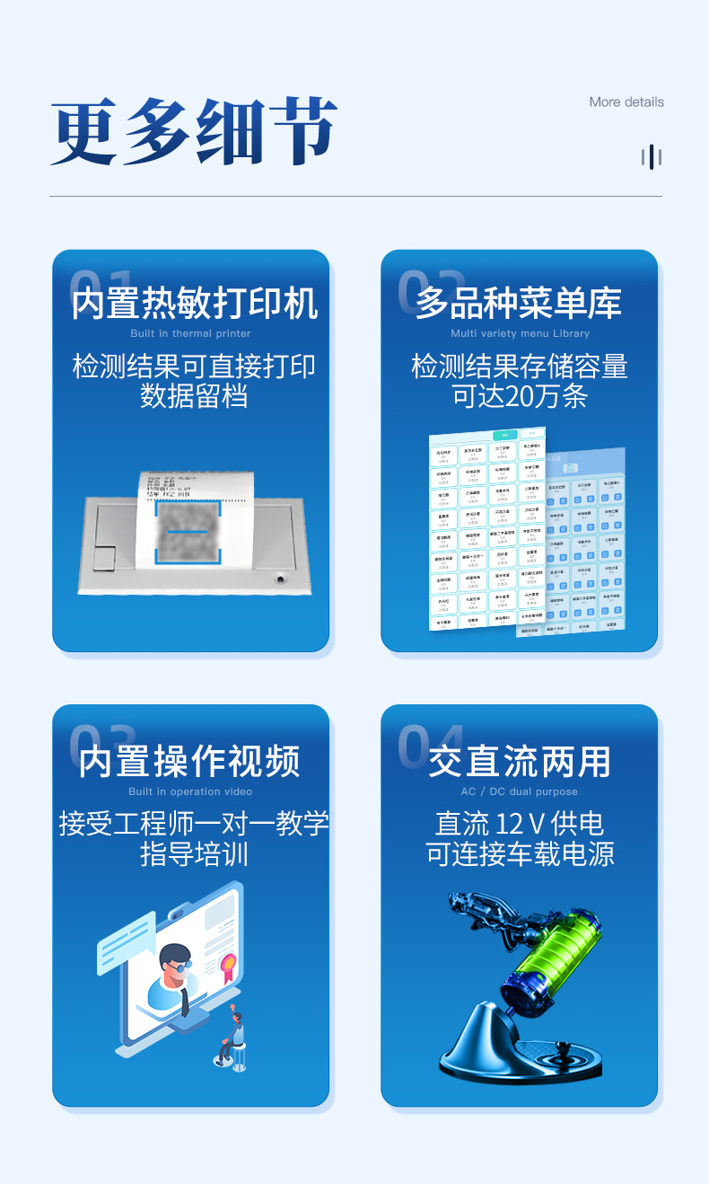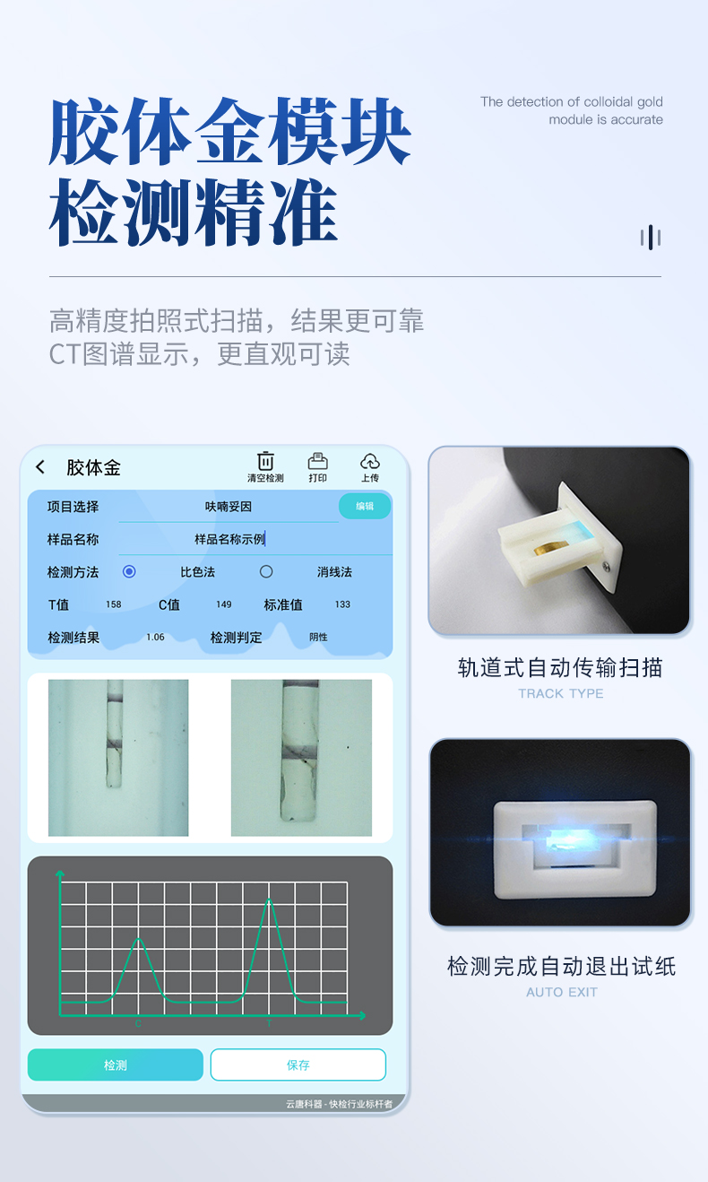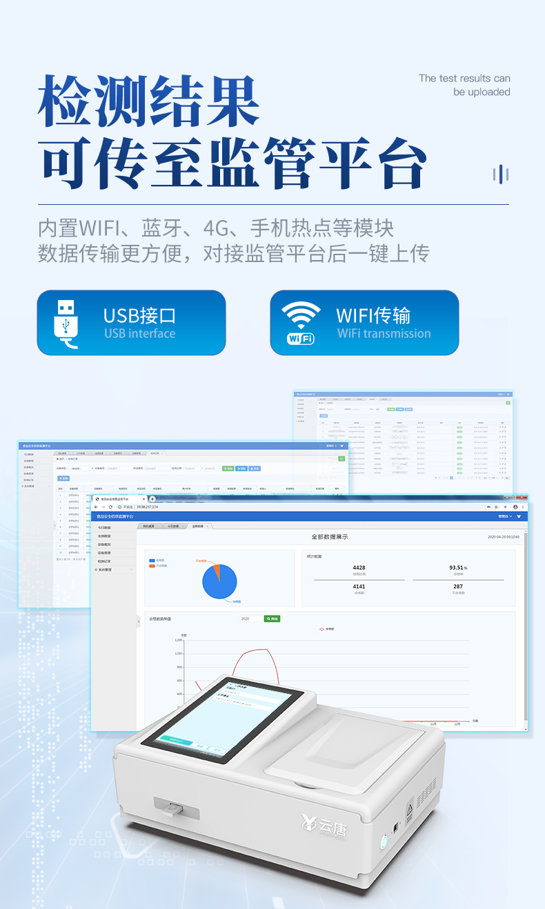 儀器采用10.1英寸液晶觸摸屏顯,搭配運行安卓智能操作系統,主控芯片采用ARM Cortex-A7,RK3288/4核處理器,主頻1.88Ghz,運轉速度更快速,性能更強。 | 儀器功能包括:膠體金檢測模塊、數字化管理模塊、無線通訊模塊等,可以滿足同一軟件下實現所有檢測項目的檢測,并在同一窗口展示檢測結果。 | 一體化臺式快檢設備,采用交直流兩用供電方式,可連接車載電源,配備6ah大容量充電鋰電池,可以滿足現場及流動檢測使用的需求。儀器尺寸:43×35×20cm, 主機凈重:5.1kg | 系統自帶數據集成模塊,設備首頁自動統計檢測數據包含:周檢測數據、月檢測數據,全部檢測總數量,均包含檢測總數,合格數,不合格數,以及相關柱形分析圖,對各項檢測數據清晰掌握,無需電腦查詢,更加快捷直觀。 | 儀器具有任務預設模塊,可在樣品送檢前提前預設樣品名稱、檢測指標、送檢單位等信息,樣品送檢時一鍵調取保存信息,檢測更加方便快捷。 | 膠體金檢測模塊: 直插式自動掃描方式,可實時顯示金標卡實時圖像,系統自動分析并呈現出CT曲線圖,CT線自動識別,無需手動調整,完成檢測后自動退出檢測卡。 結果判定線可修改,對照值標定值可保存,斷電不丟失數據。 兼容市場上其他膠體金卡,使用耗材不受限制,極大增強用戶使用體驗。 | 儀器檢測系統擁有龐大數據庫,并且構建了完善的檢索、修訂功能。食品庫涵蓋多種樣品名稱,可按需添加或刪除、編輯樣品名稱;產品數據庫以及歷史檢測記錄支持一鍵檢索功能。 | 系統打印自定義化,打印格式多樣化,產品合格證(國家標準要求),二維碼,抽樣信息、檢測信息,受檢信息、復核信息、抽樣日期、檢測日期等信息結果,可按需求自行設置打印內容。 | A4紙版本報告打印功能(可選配):設備擁有兩種結果展示方式,可以自動生成A4打印模板和小票打印模板兩種樣式,可通過WiFi及網線等方式鏈接外置打印機可進行打印 | 儀器具有 wifi 聯網上傳、RJ45網線連接功能,可以快速上傳數據。同步對接監管平臺,數據可局域網和互聯網數據上傳,檢測結果直接傳至食品安全監管平臺。進行區域食品安全監管及大數據分析處理與數據統計,檢測區域食品安全長短期動態,達到食品安全問題預估、預警。 | 設備支持U盤存儲,標準USB接口,免驅動安裝。檢測結果存儲容量20萬條以上,可生成Excel表格,進行一鍵拷貝,并具有登錄保護功能,可設置用戶名及密碼,規范不同人員操作權限,防止非工作人員操作,并且可以進行重新校準、鎖定、恢復出廠設置功能。儀器固件可升級,后期檢測項目可擴充。 | 儀器具備遠程升級功能,可定向分客戶分儀器更新,開機后自動更新,并可持續性免費更新系統版本,無需像傳統產品返廠更新,節省時間及人力成本并避免了物流運輸返廠升級導致設備損壞的潛在風險。 |