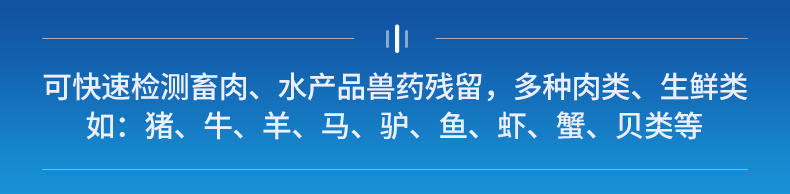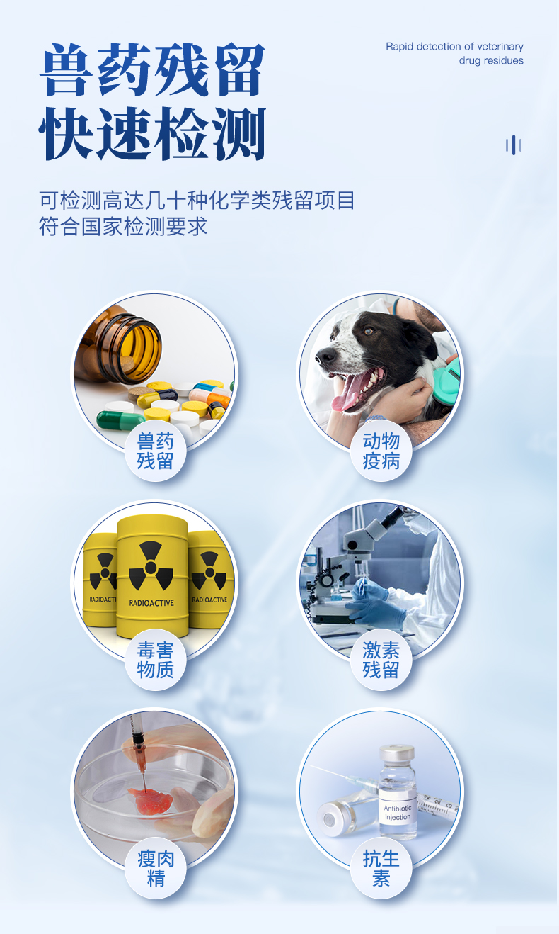 瘦肉精激素:鹽酸克倫特羅、沙丁胺醇、萊克多巴胺、己烯雌酚等 | 抗生素殘留:四環素類、硝基呋喃類、磺胺類、β-興奮劑類、沙星類、磺胺類、喹諾酮類,甲砜霉素,氟苯尼考,金剛烷胺、替米考星、慶大霉素、林可霉素、鏈霉素、恩諾沙星、環丙沙星、頭孢啦啶、青霉素、阿莫西林等 | 水產品安全類:孔雀石綠、氯霉素、呋喃妥因、呋喃西林、呋喃它酮、呋喃唑酮等 | 蛋類藥物殘留:氯霉素,四環素,磺胺類,喹諾酮類,呋喃西林,呋喃它酮,呋喃妥因,呋喃唑酮,氟苯尼考,阿莫西林、頭孢氨芐、紅霉素、鏈霉素等 | 動物疫病類:禽流感、新城疫、牛羊口蹄疫、牛羊結核病、牛羊包蟲、牛羊布病、小反芻獸、豬藍耳病毒、豬瘟病毒、豬偽狂犬病毒、豬細小、豬圓環、犬細小病毒、犬瘟熱病毒、犬狂犬病毒等 | 真菌毒素殘留:食用油、糧食及飼料中黃曲霉毒素B1、黃曲霉毒素總量,奶中黃曲霉毒素M1、嘔吐毒素、玉米赤霉烯酮、赭曲霉毒素A、T2毒素、伏馬毒素等 |