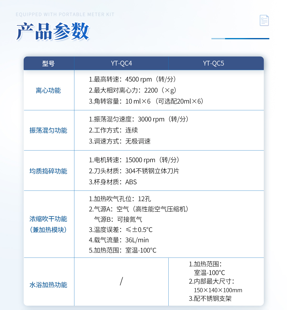 離心功能 1.**轉速:4500 rpm(轉/分) 2.**相對離心力:2200(×g) 3.角轉容量:10 mlx6 (可選配20mlx6) | 振蕩混勻功能 1.振蕩混勻速度:3000 rpm(轉/分) 2.工作方式:連續 3.調速方式:無極調速 | 均質搗碎功能 1.電機轉速:15000 rpm(轉/分) 2.刀頭材質:304不銹鋼立體刀片 3.杯身材質:ABS | 濃縮吹干功能(兼加熱模塊) 1.加熱吹氣孔位: 12孔 2.氣源A: 空氣(高性能空氣壓縮機) 氣源B: 可接氮氣 3.溫度誤差:≤±0.5℃ 4.載氣流量:36L/min 5.加熱范圍:室溫-100℃ | 水浴加熱 1.加熱范圍:室溫-100℃ 2.內部**尺寸:150mmX140mmX100mm 3.配不銹鋼支架 |