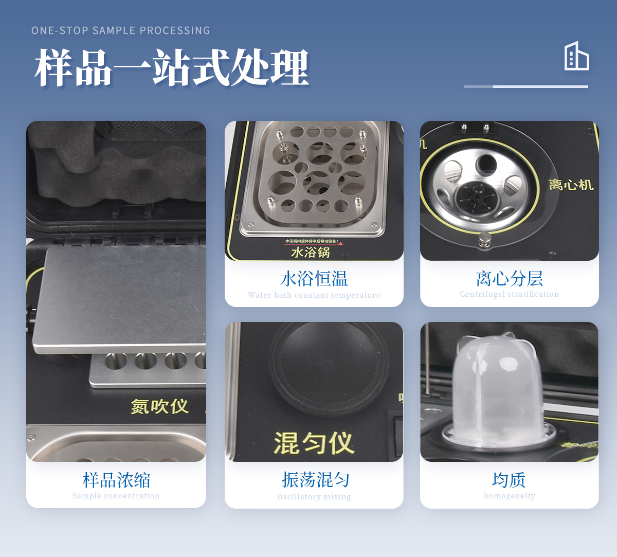 應國內用戶的實際需求,自行研制開發的新型儀器——QC05型樣品前處理一體機。樣品前處理集成箱將樣本前處理過程中樣品濃縮、水浴恒溫、離心分層、均質、振蕩混勻等步驟所需設備進行集成,僅需一臺樣品前處理集成箱設備即可完成所有樣本前處理過程,并且方便攜帶,不僅適用于現場檢測使用,還可用于色譜、質譜等分析樣品的純化和制備。