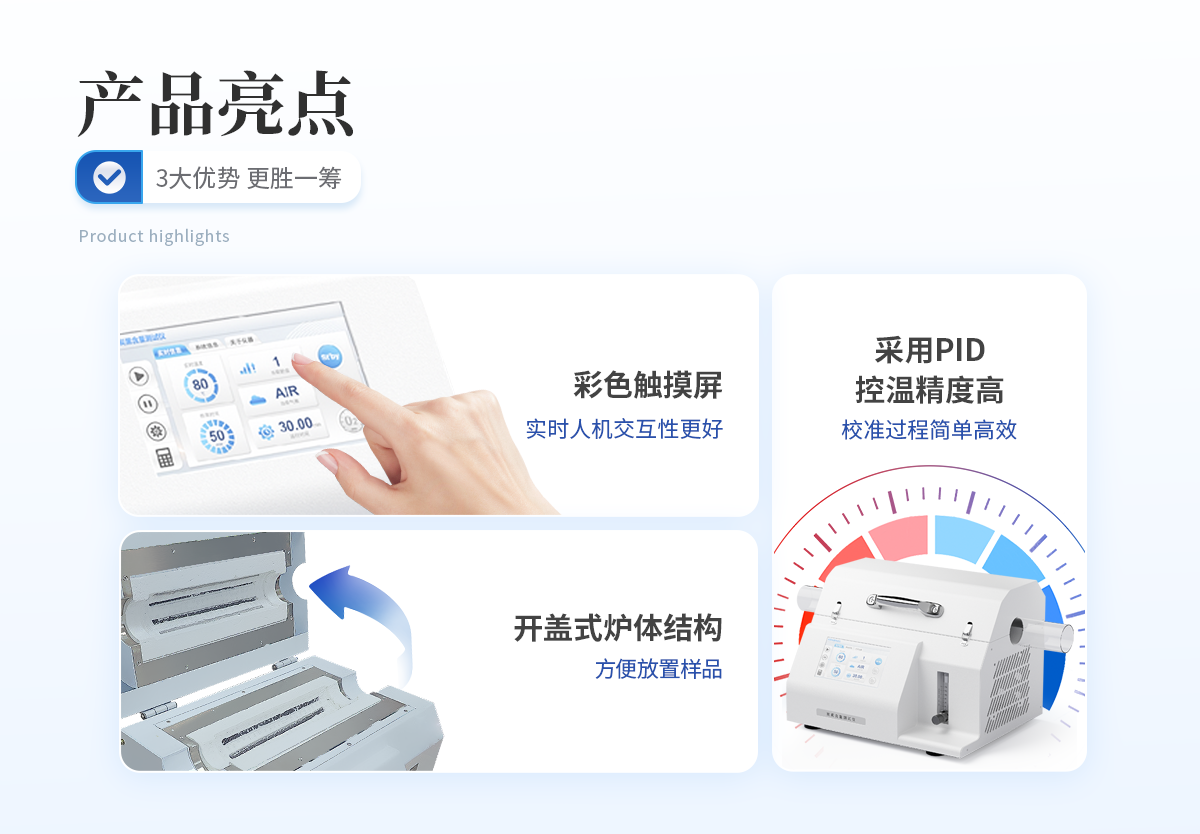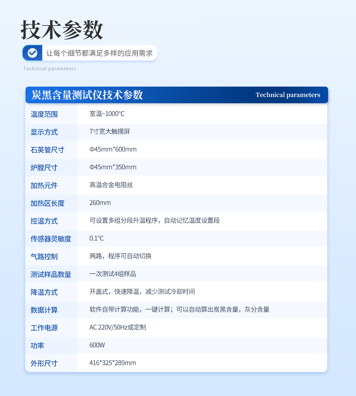 1. 采用開蓋式爐體結構,方便放置樣品且散熱效果更佳。 | 2. 爐膛采用超長加熱單元,可同時測試4組樣品,大大提高測試效率。 | 3. 軟件自帶計算功能,可以一鍵自動計算出炭黑含量、灰分含量,非常得方便快捷。 | 4. 采用PID精準控溫,控溫精度高,溫度范圍大,爐膛溫度均勻性高。 | 5. 7寸液晶觸摸屏顯示,可一鍵操作啟動,設定恒溫時間,恒溫精度高; | 6. 智能化可編程控制,可設置多組分段升溫程序。 |
