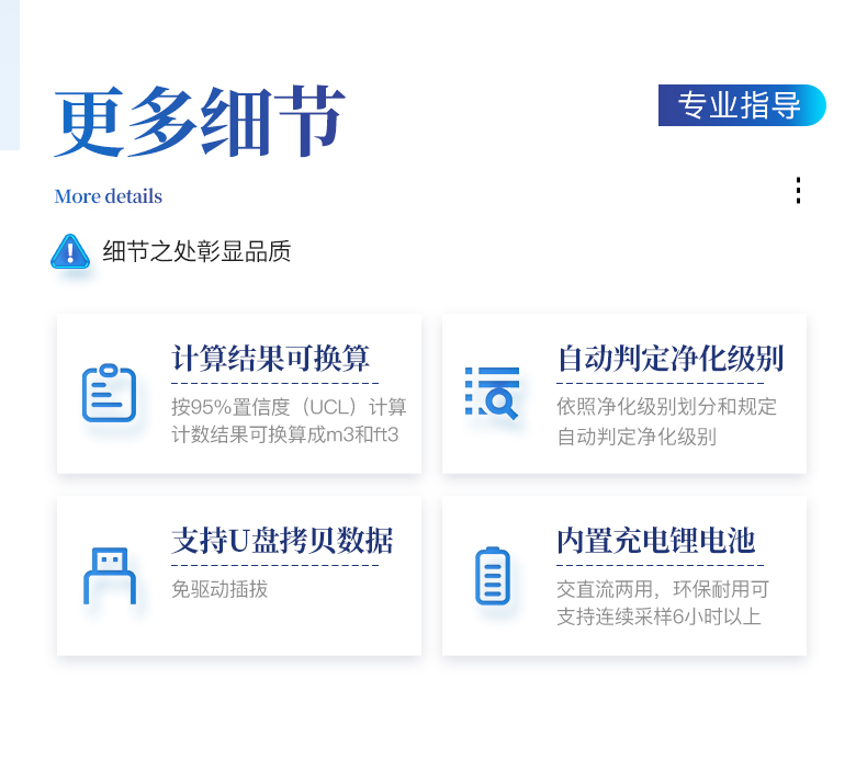 1、安卓系統(tǒng)7.1版本,操作交互體驗(yàn)更好。 2、內(nèi)置溫濕度傳感器、環(huán)境氣壓傳感器 3、核心部件光散射傳感器明顯消除腔體的雜散光,信噪比大為提高。從而使測量更準(zhǔn)確更可靠。 4、按95%置信度(UCL)計(jì)算,計(jì)數(shù)結(jié)果可換算成m3和ft3 5、依照凈化級別劃分和規(guī)定,自動判定凈化級別,使用便利。 6、帶審計(jì)追蹤功能,可查詢、可追溯、可控制,符合FDA 21CFR PART11規(guī)范 7、支持wifi、藍(lán)牙傳輸,數(shù)據(jù)可無線上傳;同時(shí)支持U盤拷貝數(shù)據(jù),免驅(qū)動插拔。 8、配置監(jiān)管平臺,檢測結(jié)果可直接無線傳至平臺,進(jìn)行潔凈度長短期分析,輔助管理。 9、內(nèi)置新一代高速熱敏打印機(jī),可選擇所需要打印的粒徑通道,靈活打印結(jié)果。 10、交直流兩用,內(nèi)置充電鋰電池,環(huán)保耐用可支持連續(xù)采樣6小時(shí)以上。 11、便捷簡易伸縮式云臺支架,安裝采樣操作更加方便。