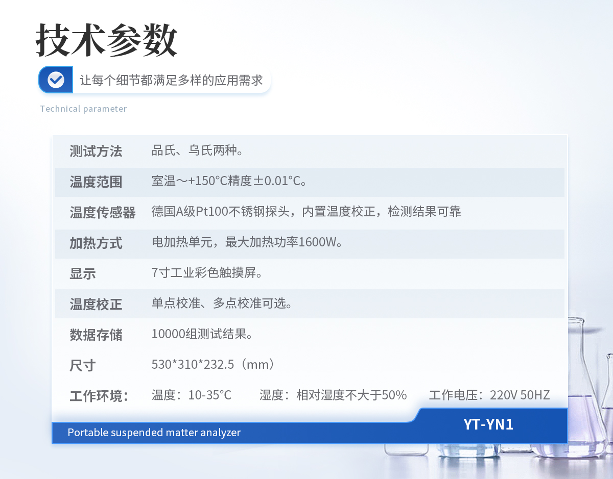 測(cè)試方法:品氏、烏氏兩種。 溫度范圍:室溫~+150°C精度±0.01°C。 溫度傳感器:德國(guó)A級(jí)Pt100不銹鋼探頭,內(nèi)置溫度校正,檢測(cè)結(jié)果可靠。 加熱方式:電加熱單元,**加熱功率1600W。 顯示:7寸工業(yè)彩色觸摸屏。 溫度校正:?jiǎn)吸c(diǎn)校準(zhǔn)、多點(diǎn)校準(zhǔn)可選。 數(shù)據(jù)存儲(chǔ):10000組測(cè)試結(jié)果。 尺寸:530*310*232.5(mm) 工作環(huán)境: 溫 度:10-35℃ 濕 度:相對(duì)濕度不大于50% 工作電壓:220V 50HZ