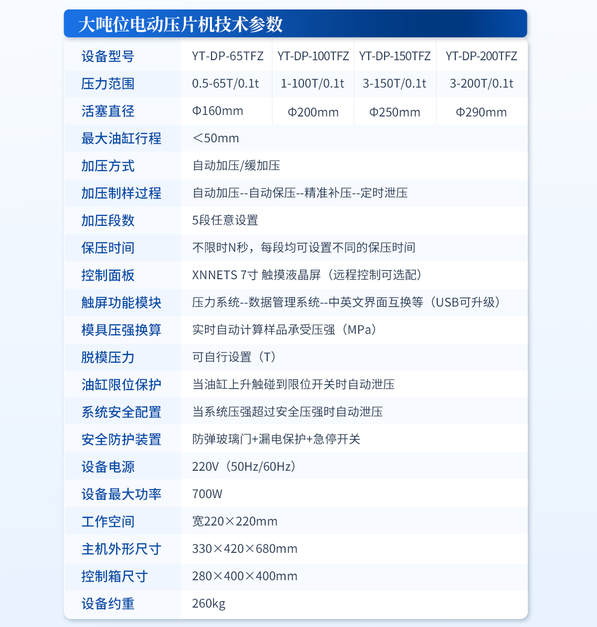 設備型號:YT-ZP-40T | 壓力范圍:0.4-40T/0.1t | 油缸直徑:Ф130mm | 油缸行程 :<50mm | 加壓方式:自動加壓/緩加壓 | 加壓制樣過程:自動加壓--自動保壓--精準補壓--定時泄壓 | 加壓段數:5段任意設置 | 保壓時間:不限時N秒,每段均可設置不同的保壓時間 | 控制面板:XNNETS 7寸 觸摸液晶屏(遠程控制可選配) | 觸屏功能模塊:壓力系統--數據管理系統--中英文界面互換等(USB可升級) | 模具壓強換算:實時自動計算樣品承受壓強(MPa) | 脫模壓力:可自行設置(T) | 油缸限位保護:當油缸上升觸碰到限位開關時自動泄壓 | 系統安全配置:當系統壓強超過安全值時自動泄壓 | 安全防護裝置:防彈玻璃門+漏電保護+急停開關 | 設備電源:220V(50Hz/60Hz) | 設備**功率:400W | 工作空間:寬160×180mm | 外形尺寸 :280×460×550mm | 設備估重 :110kg | 配置說明:壓片機1臺,模具選配!可根據需求定制壓片機或模具 |