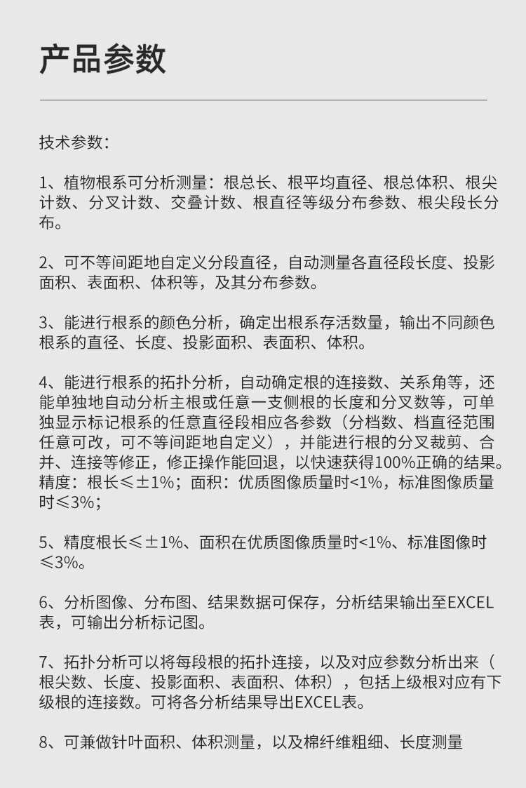 WinRHIZO軟件可以讀取TIFF,JPEG標準格式的圖像。針對獲取的圖像,利用插入加密狗解密的軟件,同時配合廠家針對掃描儀配置的Scanner.cal校準文件,對掃描獲得的高質量根系圖像進行分析。采用非統計學方法測量計算出交叉重疊部分根系長度、直徑、面積、體積、根尖等基本的形態學參數;利用軟件的色彩等級分析功能,還可以對根系顏色進行分析,從而進行根系存活數量、根系生長和營養狀況等方面研究;利用軟件的**分析功能,還可以對完整的植物根系圖像進行根系連接分析(研究根系分支角度、連通性等形態特征)、根系拓撲分析(研究根系連接數量、路徑長度)和根系分級伸展分析(記錄根系整體等級分布情況)。從而滿足研究者針對植物根系不同類別和層次的研究。